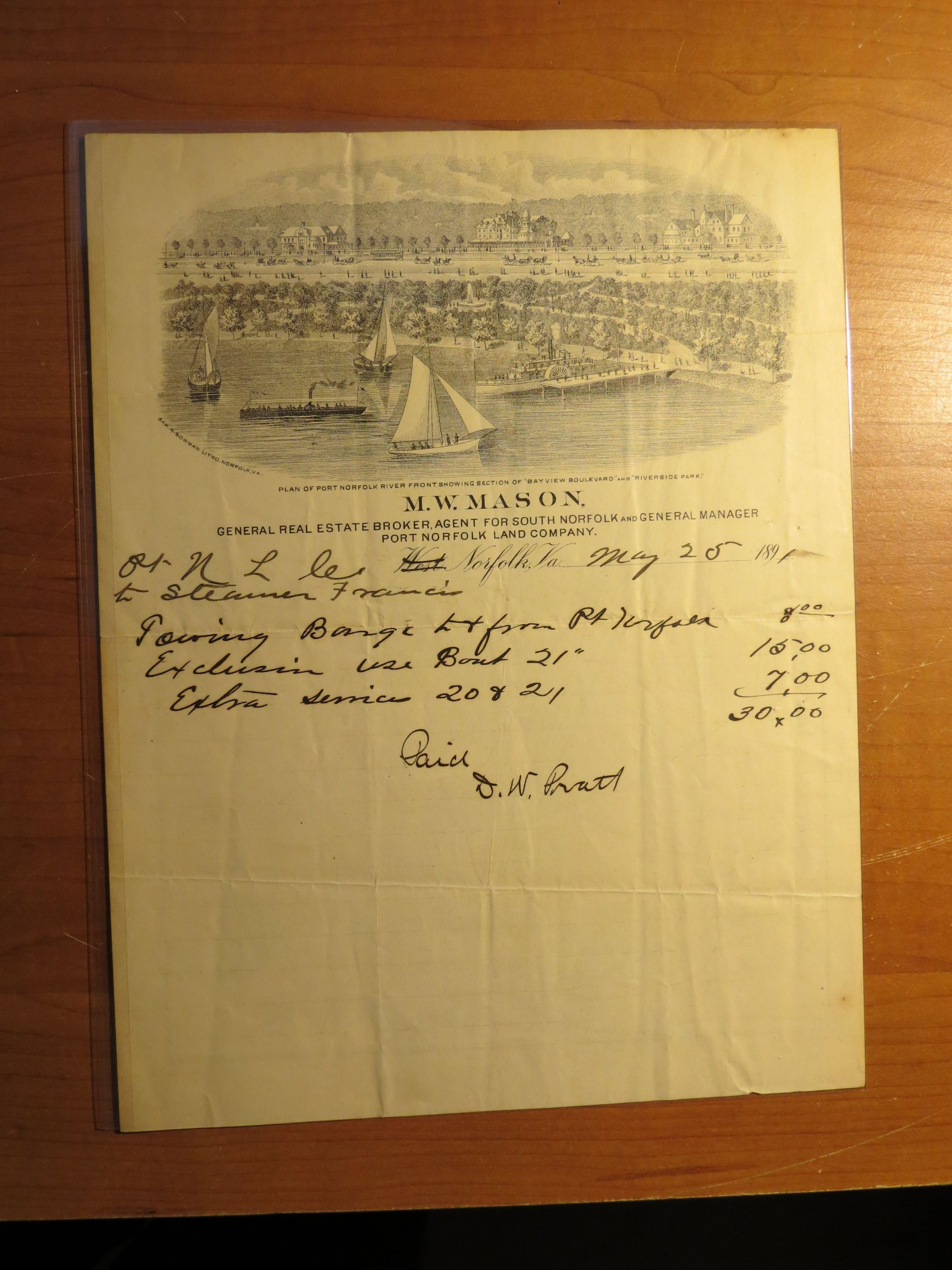 Black and white map of Norfolk and Vicinity. One side of map shows railroads constructed, chartered, and proposed. Back side of map includes lithograph print of a plan of Port Norfolk River Front; includes printed text: M.W. Mason, etc. and handwritten calculations/receipt signed by D.W. Pratt.Condition