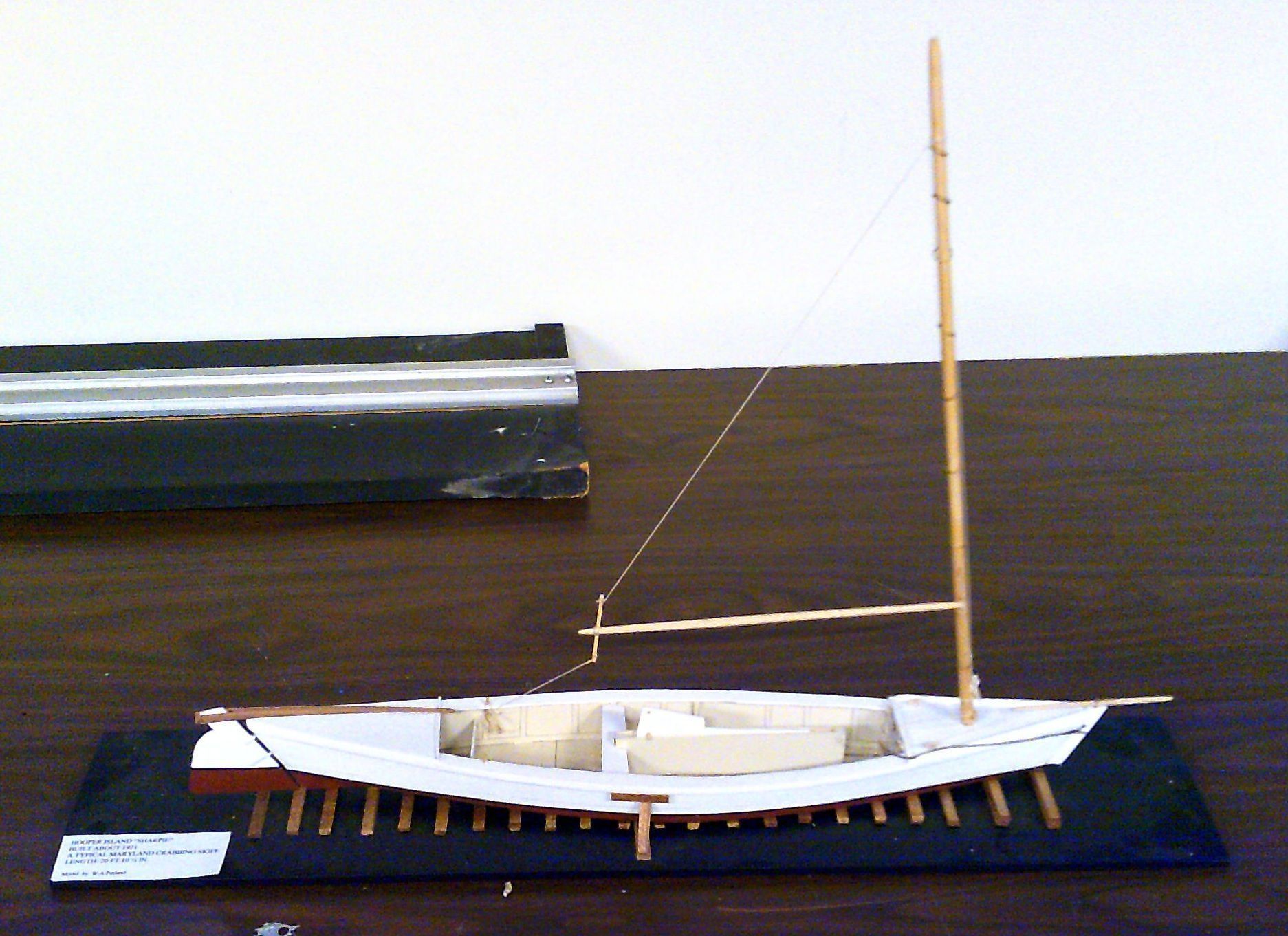 Model Boat of Hooper Island Sharpie. Model is mounted on plywood painted black.