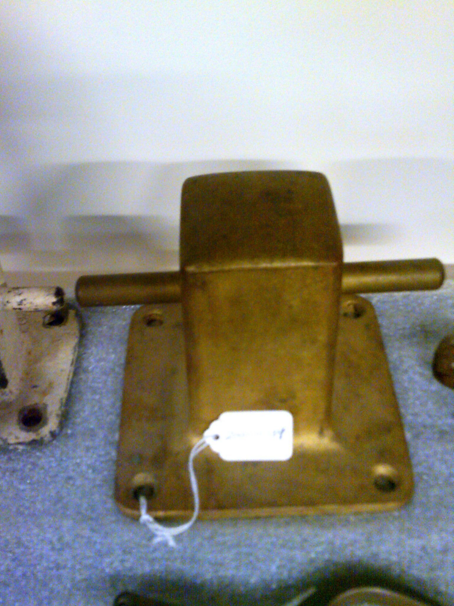 Sampson Post painted gold. Post was used to tie ropes on a ship. Four holes in base for attaching to ship. Heavy.
