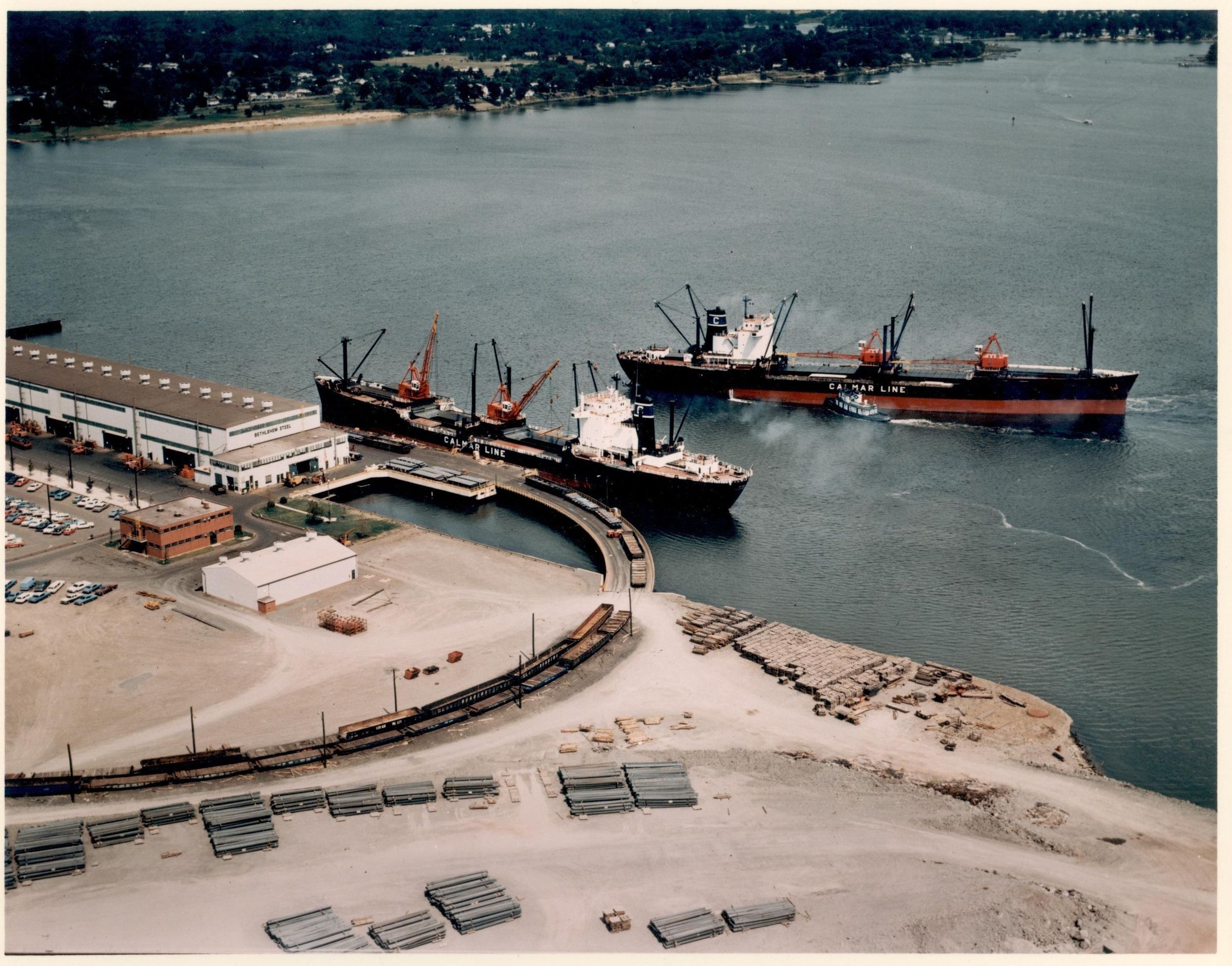 Color image of 2 Calmar ships. On at the wharf and one coming in with pilot. Calmar was a subsidiary of Bethelehem Steel, Penwood wharf, Sparrows Point MD, Bethship