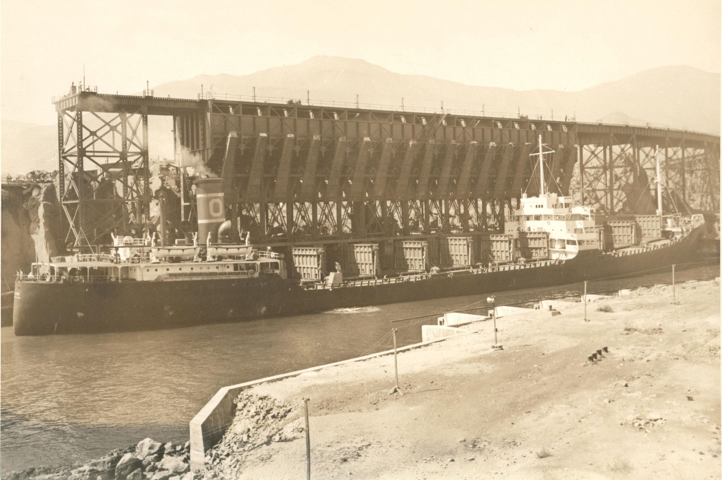 B & W image, show machinery loading iron ore on a ship. stack has a big O on it.