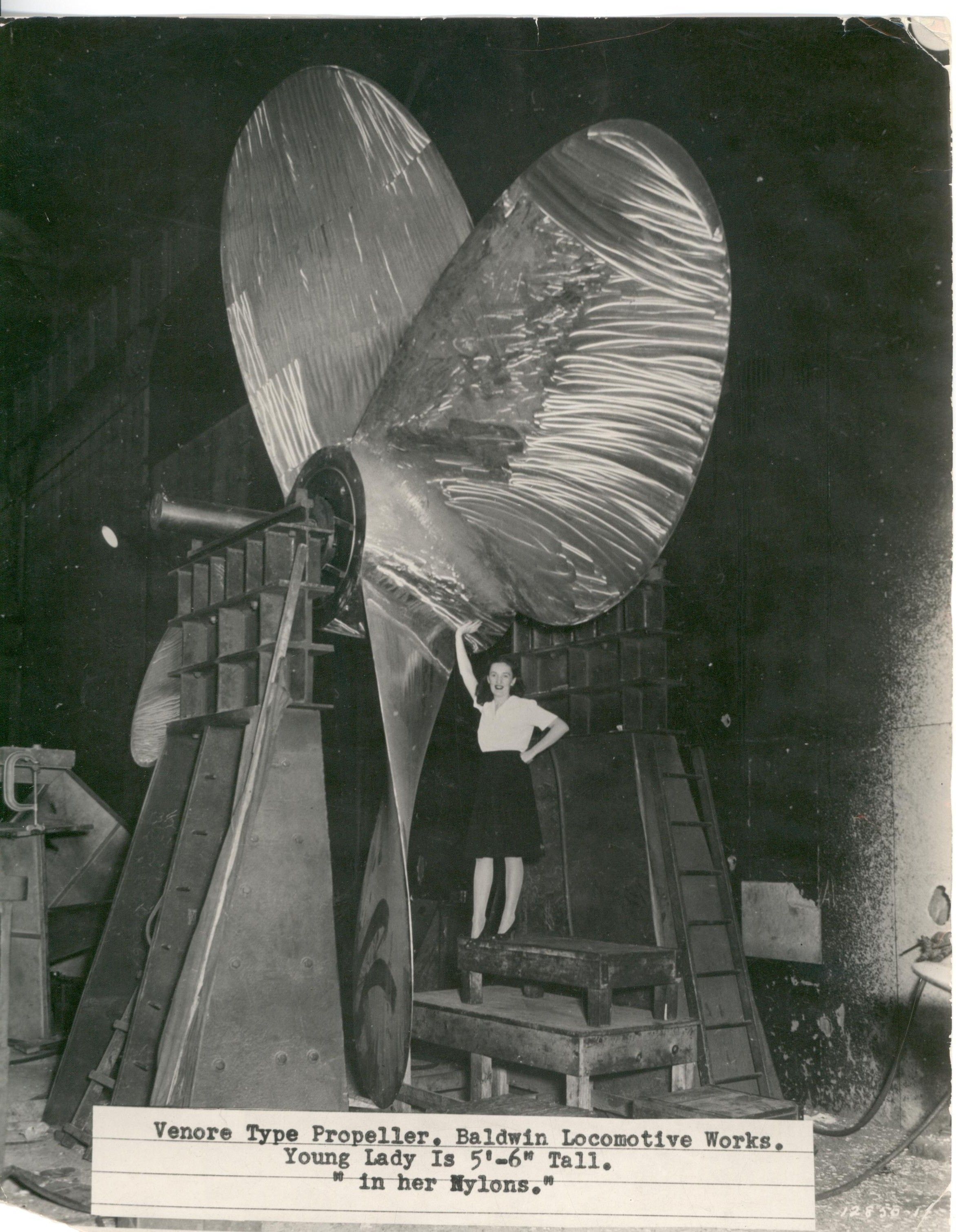 Caption at bottom of image says, "Venore Type Propeller, Baldwin Locomotive Works. Young Lady is 5'6" Tall. 'In Her Nylons."
