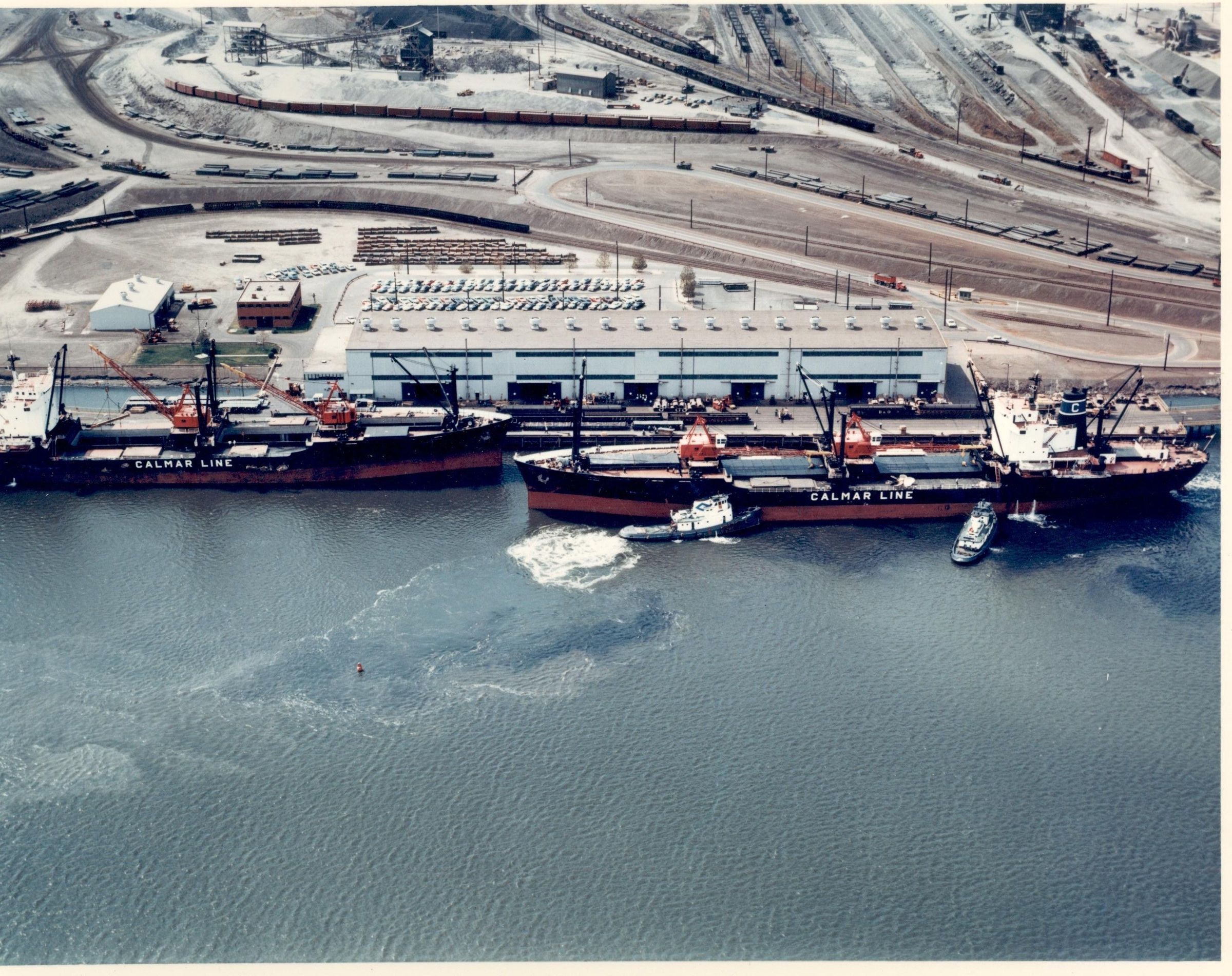 Aerial color image of Calmar line vessels, a subsidiary of Bethlehem Steel.