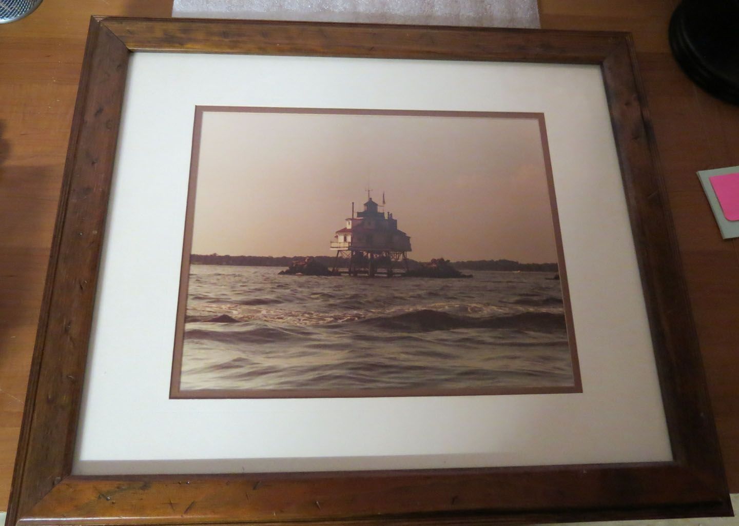 Color photograph of lighthouse. Thomas Point lighthouse. Wooden frame. Inscription on back reads "Thomas Point Light August 1980."