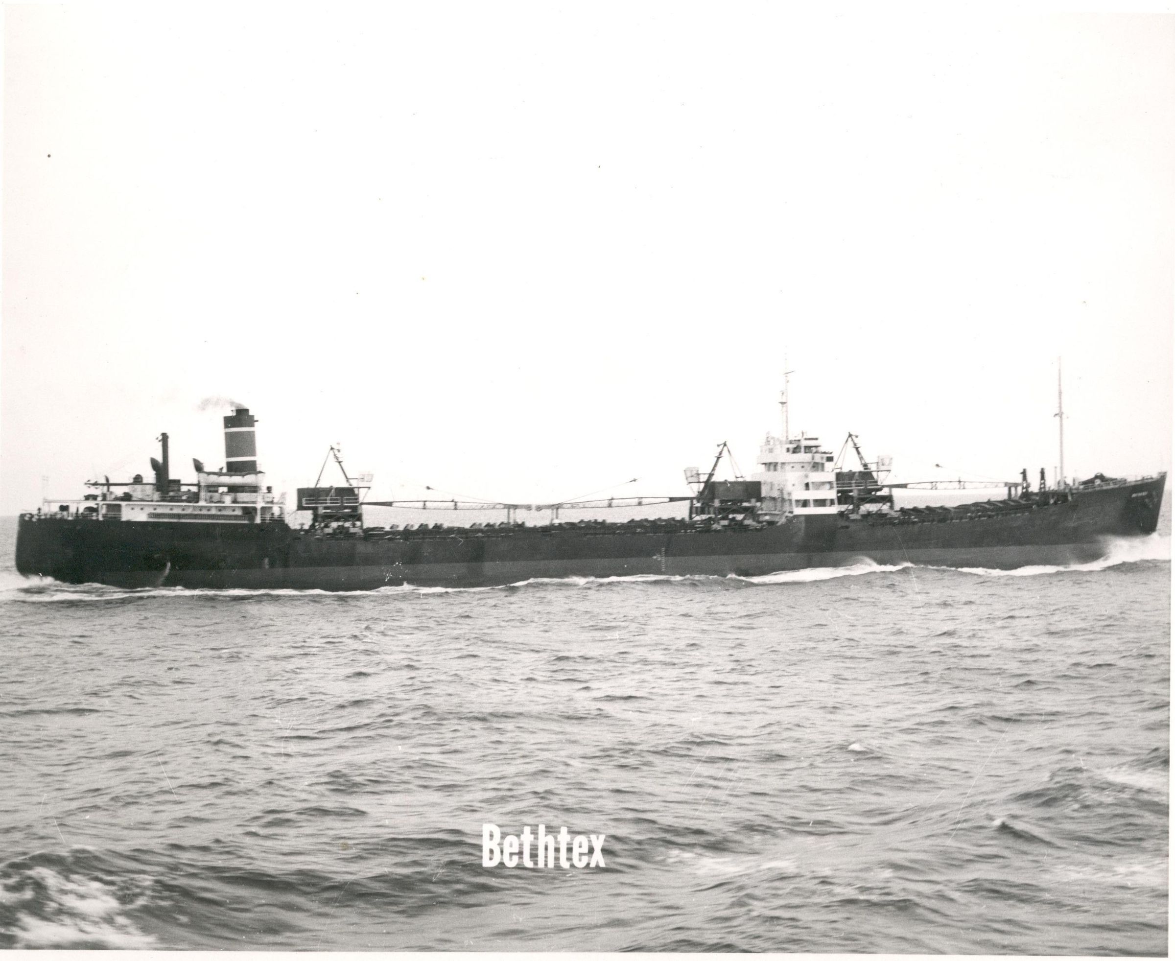 B & W image of the"Bethtex". The ship is underway and not at the wharf. In white letters the image says "Bethtex."Collection
