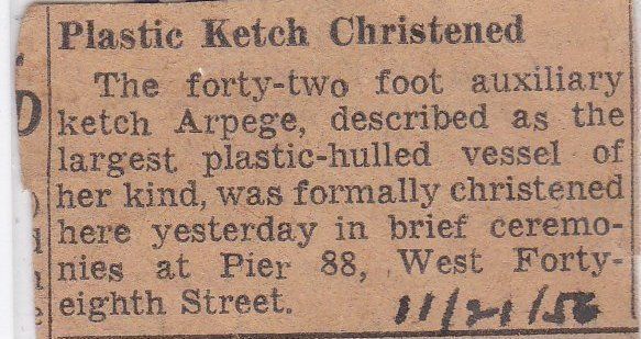 The 42 foot auxiliary ketch Arpege, decribded as the largest plastic-hulled vessel of her kind was formally christened here yesterday in breid ceremonies at pier 88, West 48th streetCollection