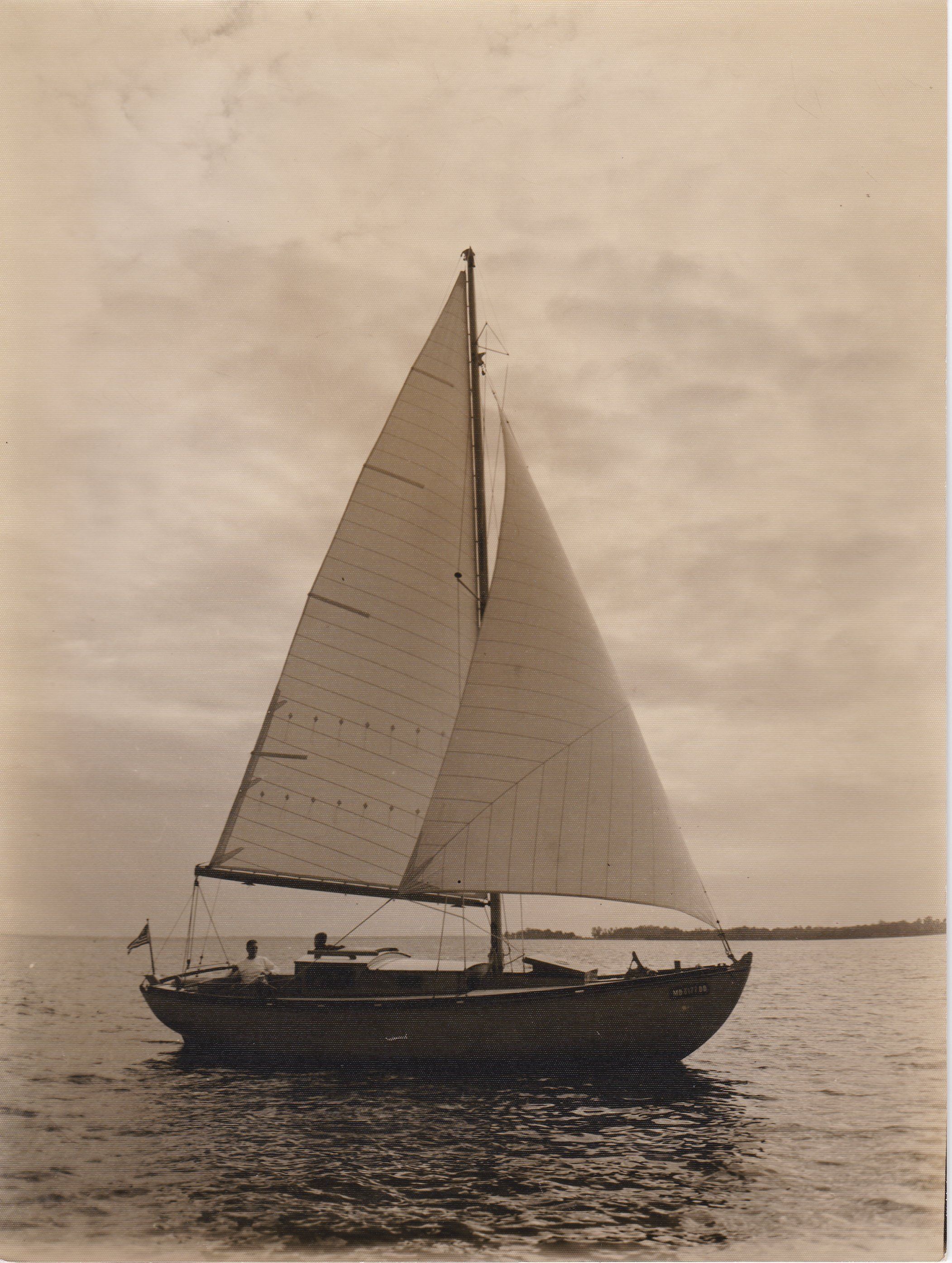 1 man is sailing it. There is an american Flag in the back of the boat.