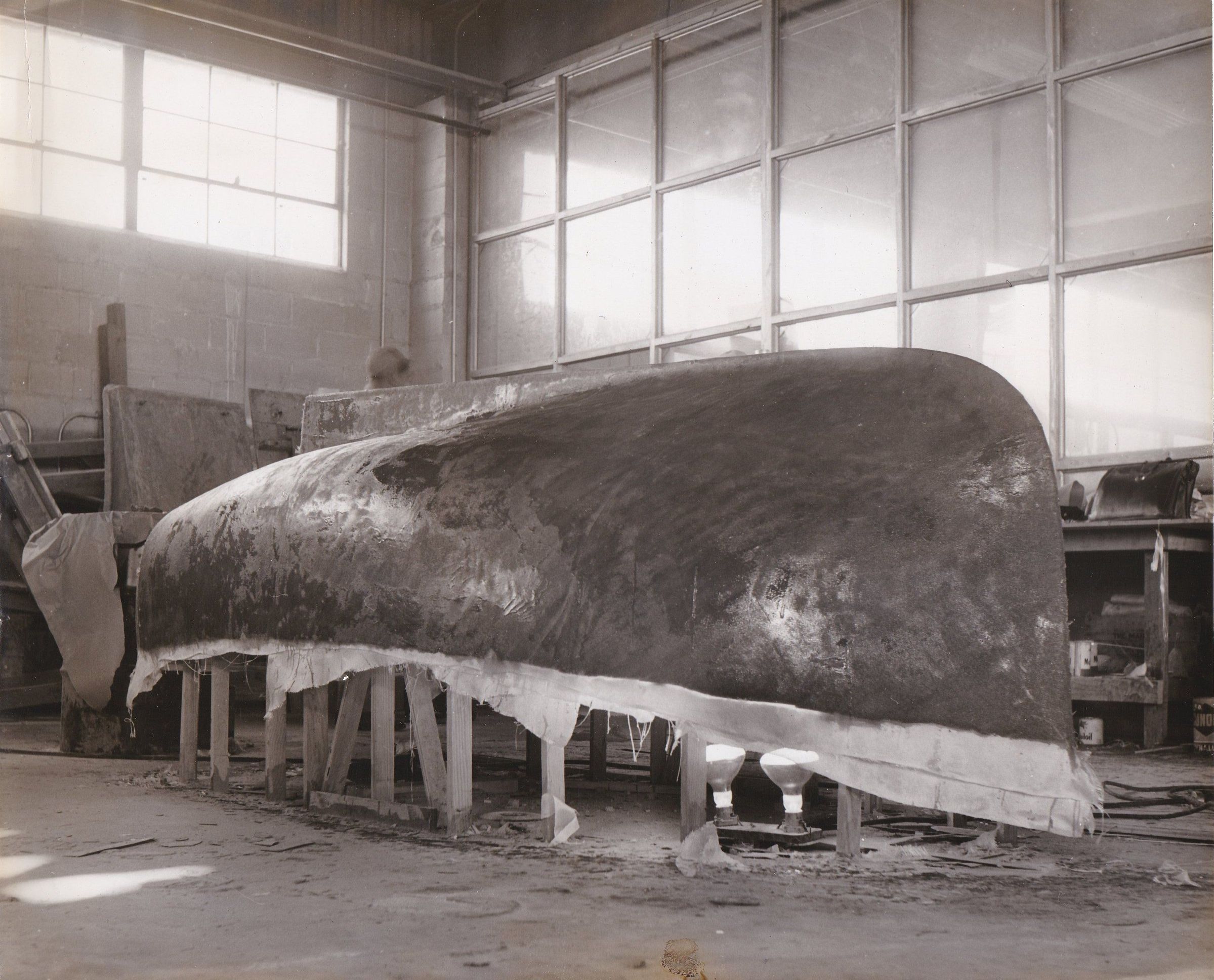 The lay up of the first 6 layers is finished. Infra red bulbs put inside the shell encrease the temperature and thus help the resin to set up.Collection