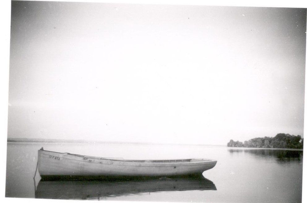B & W image of a boat at anchor in Swan Creek.
