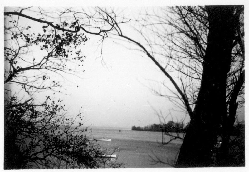 B & W image of Swan Creek from wooded area on land. Two small boats in distance.