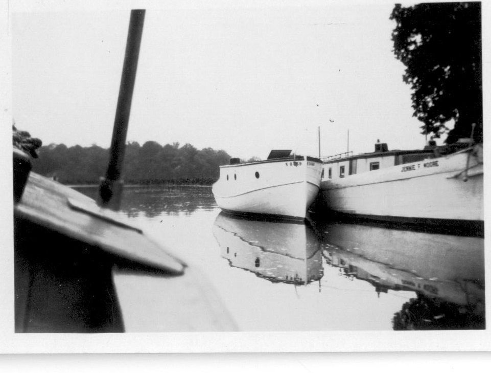 B & W image of two boats on the water. Back says, " Fishhawk. Bob McGaws Nancy Cutter." Bob McGaws was a locally known duck decoy maker.