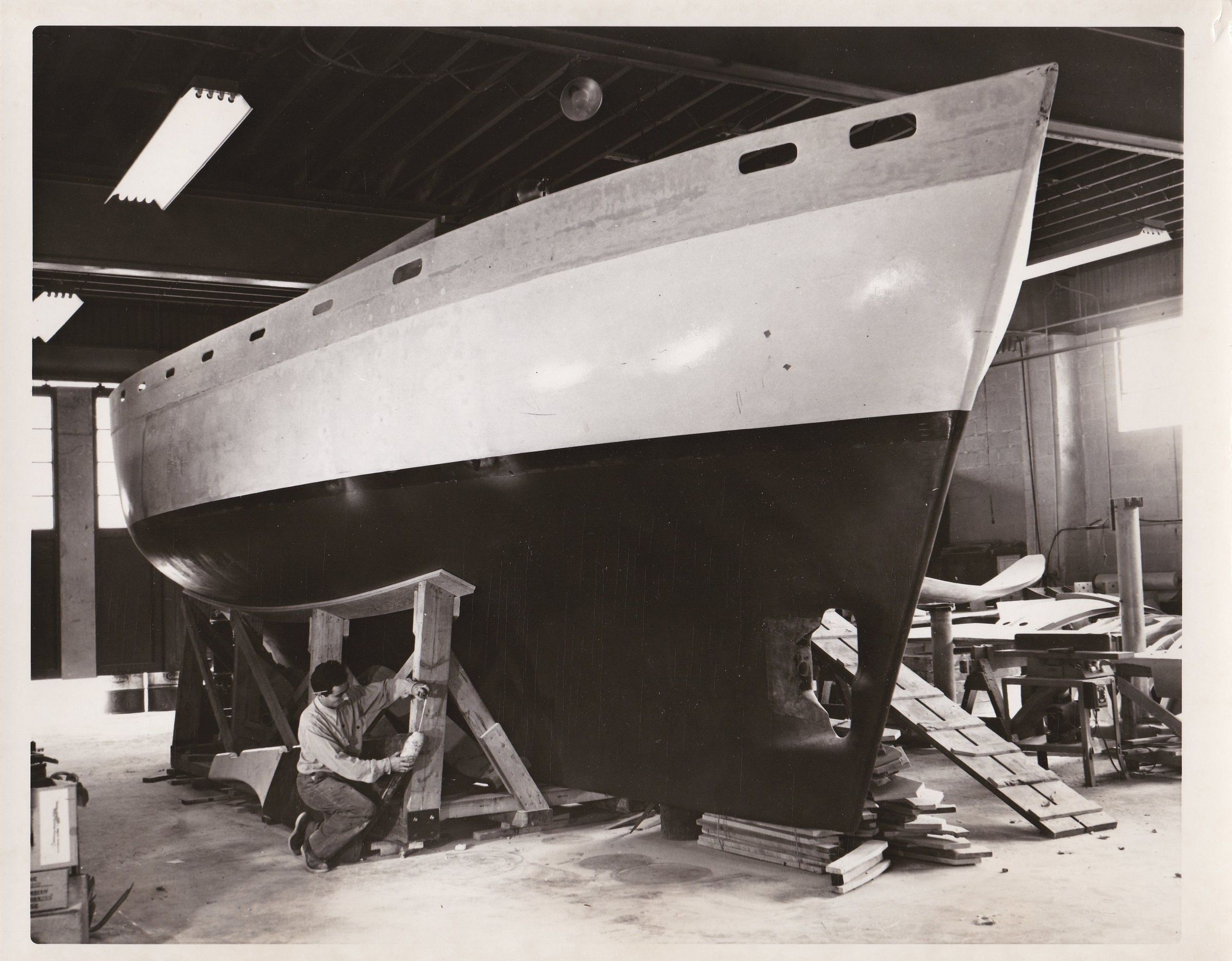 With the hull completed, the 42 foot Arpege rests inside the Luria- Cournand, Inc., plant at Havre de Grace, MD., prior to shipping to New York for the Annual NAtional Motor Boat Show.Collection