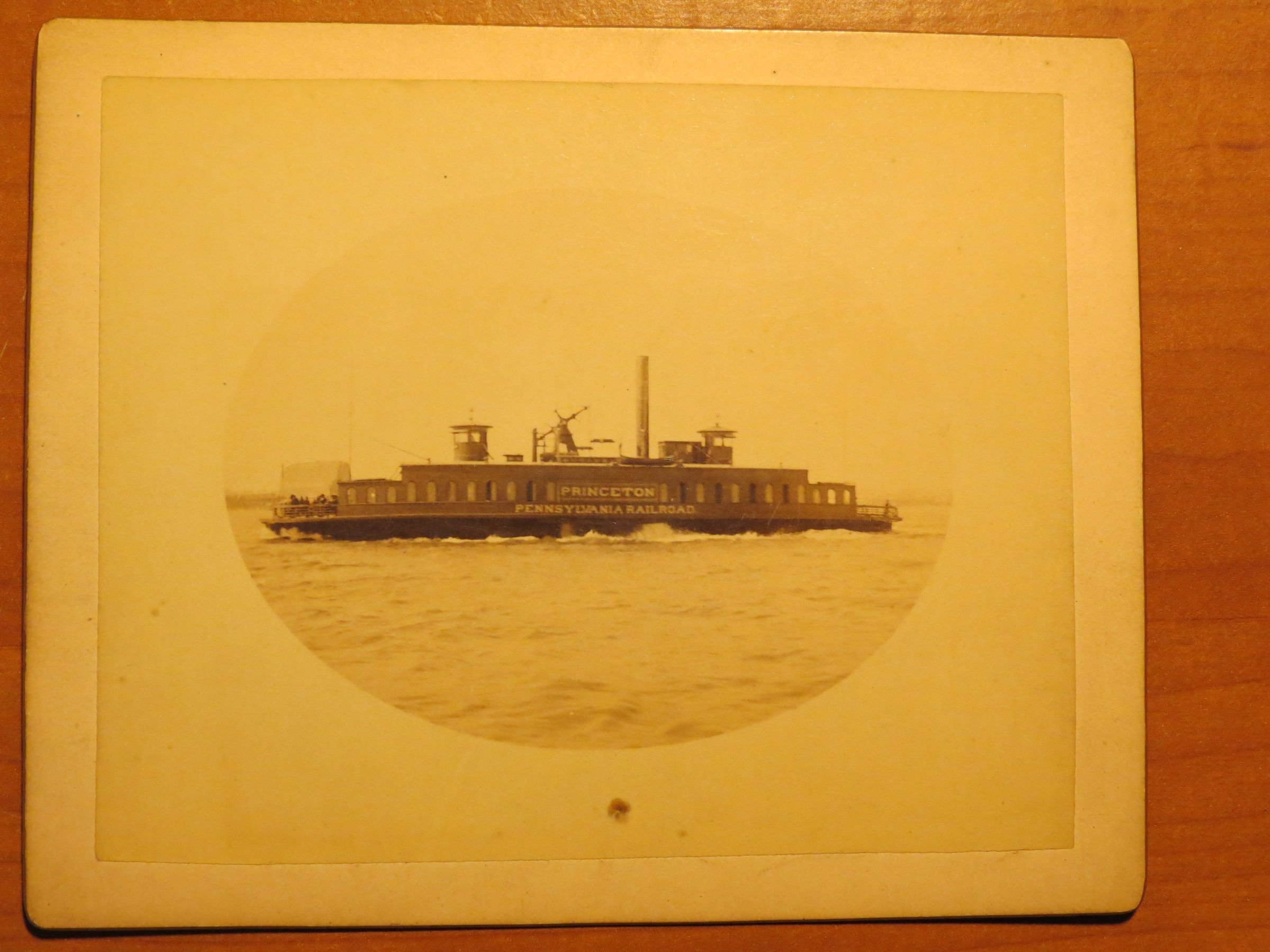 Black and white photograph of Princeton Pennsylvania Railroad steamboat on cardstock with gold edging.