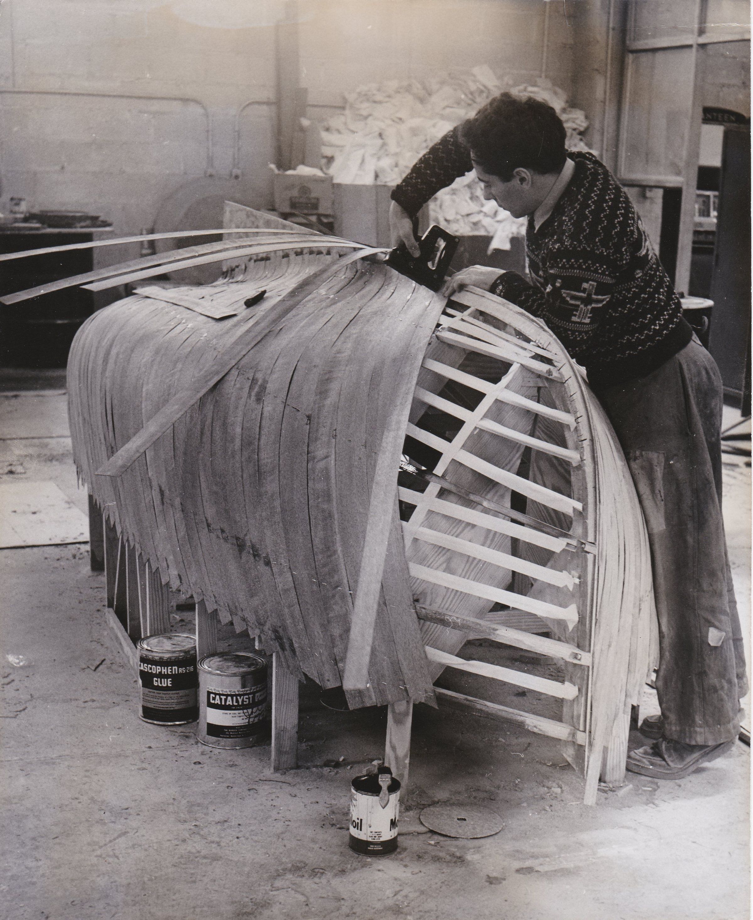 Covering the boat with the frist layer of veneer. The stripes are stapled along the mahogany frames and also glued to them with Cascophene Glue. The pines freams which will be removed have been previously covered with masquing tape.Collection
