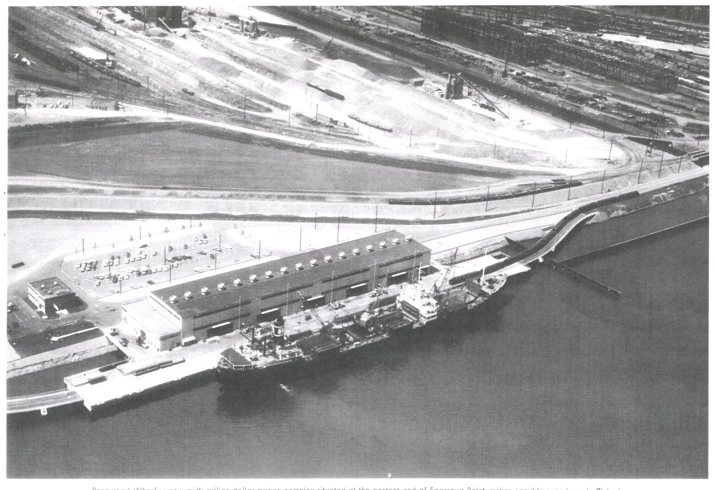 B & W photograph that is a reproduction. Image has a caption at bottom. Pennwood Wharf, a new multi-million dollar marine complex situated at the eastern end of Sparrows Point, makes possible speedy and efficient shipment of steel products direct to domestic and overseas ports. Heated warehouse protects steel until it is ready for loading.Collection
