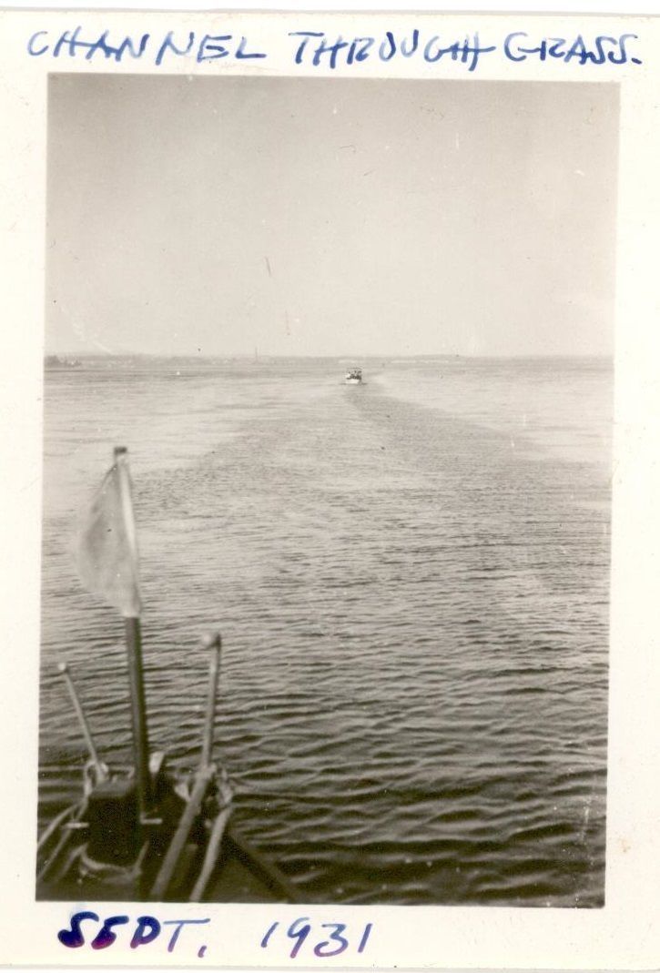 B & W image of "Channel through Grass Sept. 1931." Bow of one ship was where image was taken. Another boat in front in distance.