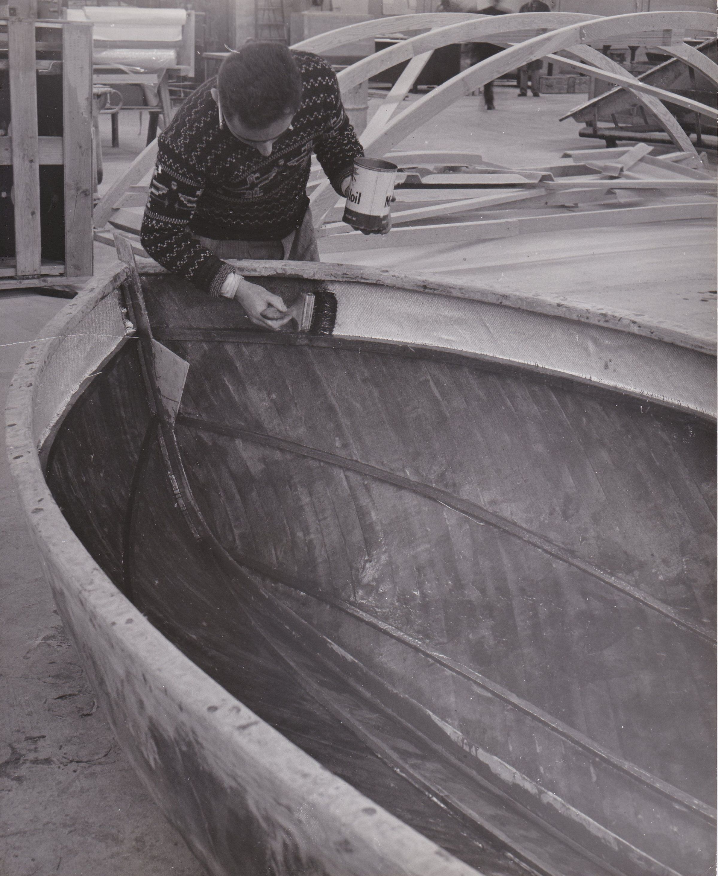 The molds and the pine frames are out. The lay up of 1 layer of fiberglas on the inside is almost completed. This single transparent layer is almost invisible.Collection