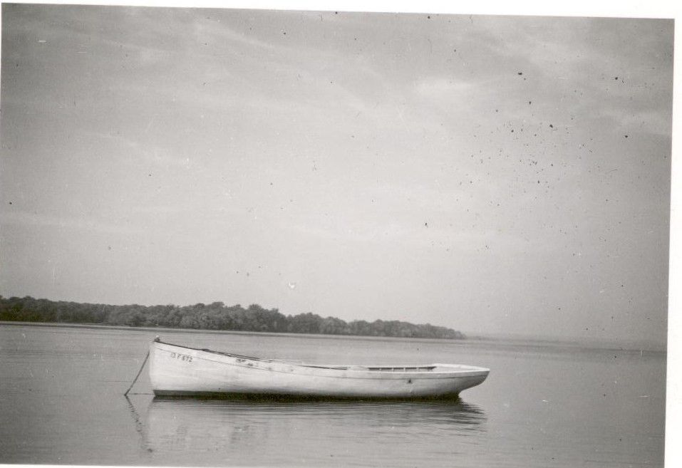 B & W image of a boat at anchor in Swan Creek.