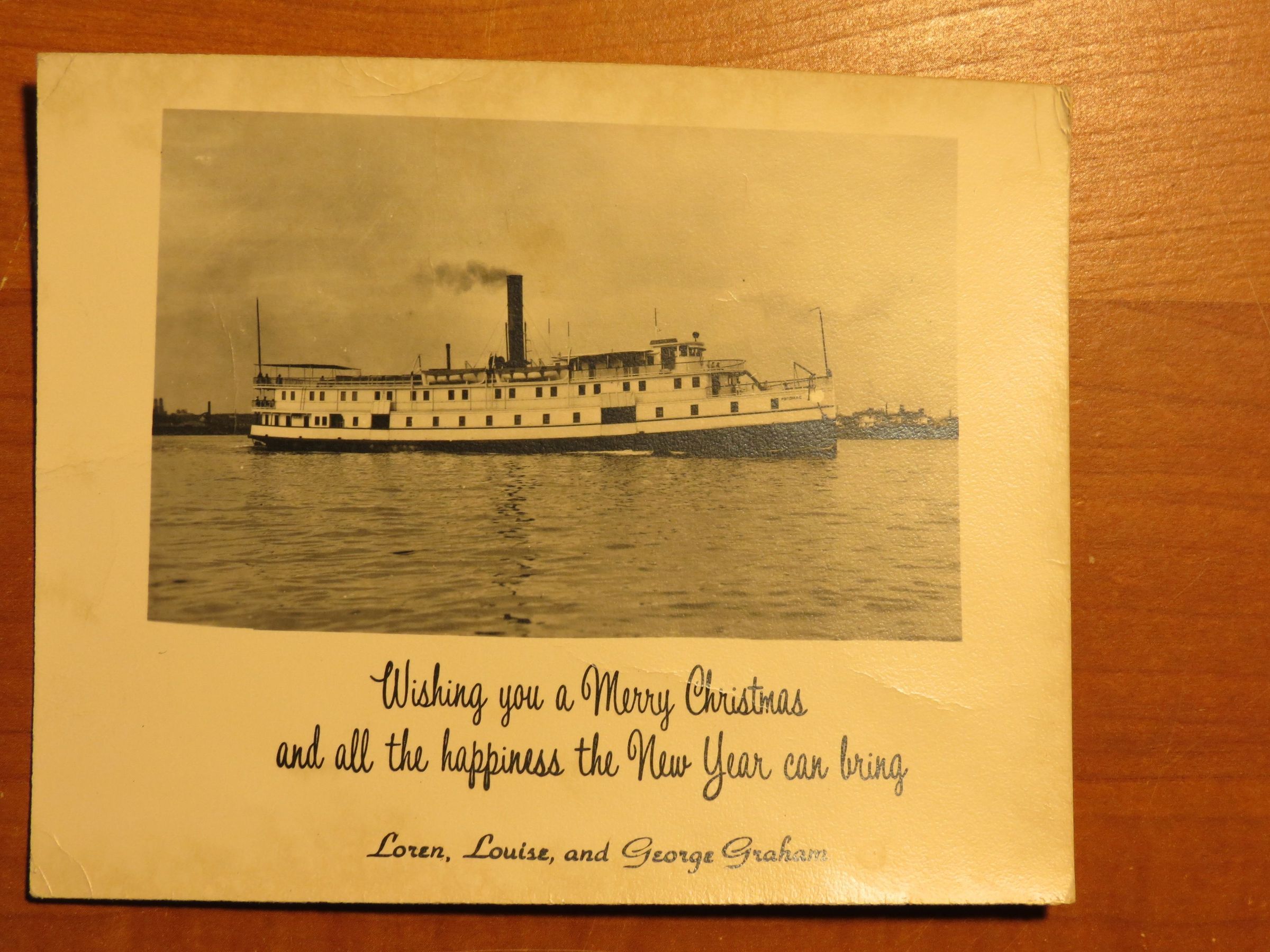 Black and white photograph of S.S. Potomac as per handwritten note on back. Christmas card with scripted print text: "Wishing you a Merry Christmas and all the happiness the New Year can bring" "Loren, Louise, and George Graham".Condition