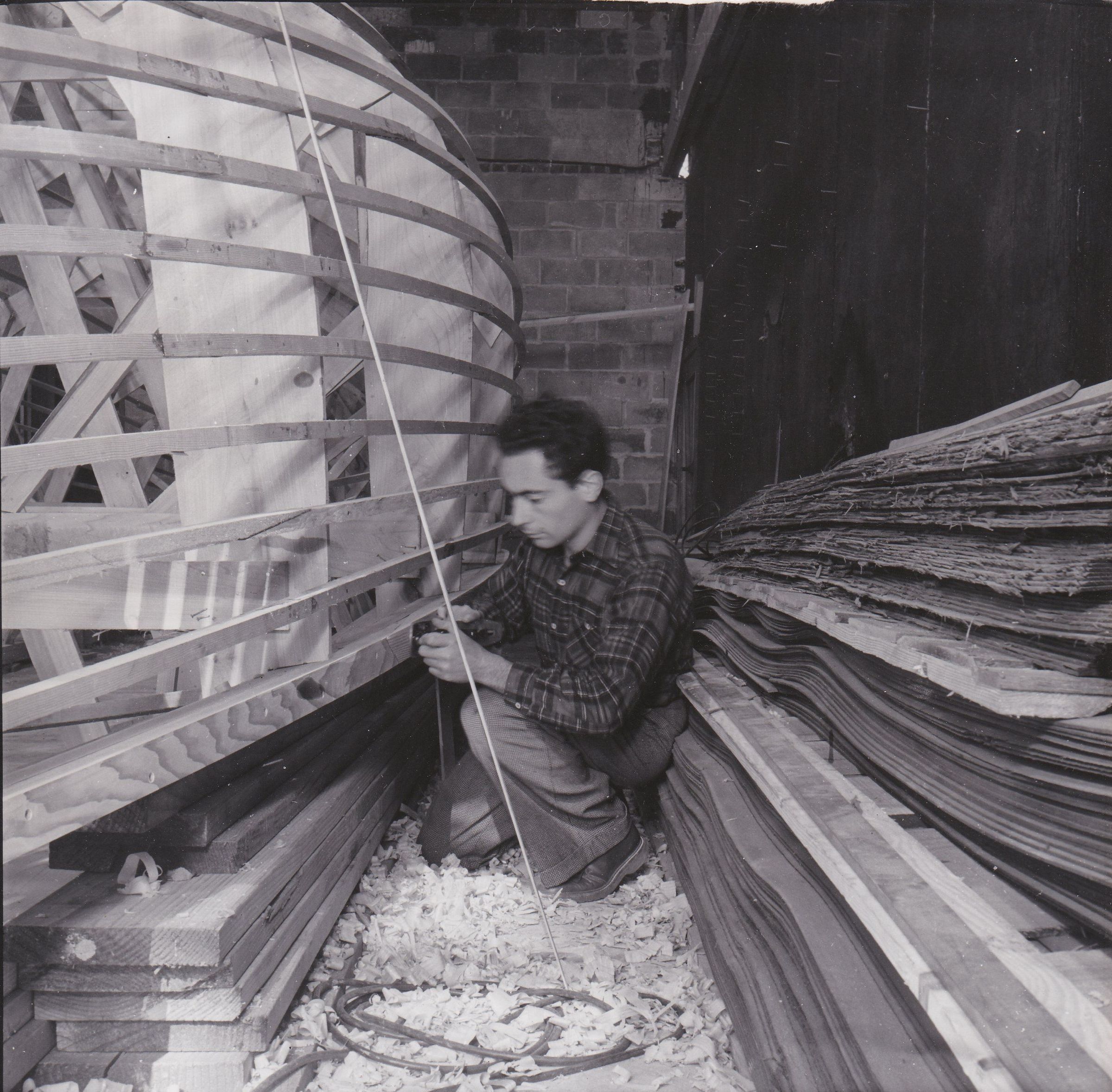 Jean Filloux by the frame of the boat working on the outer part