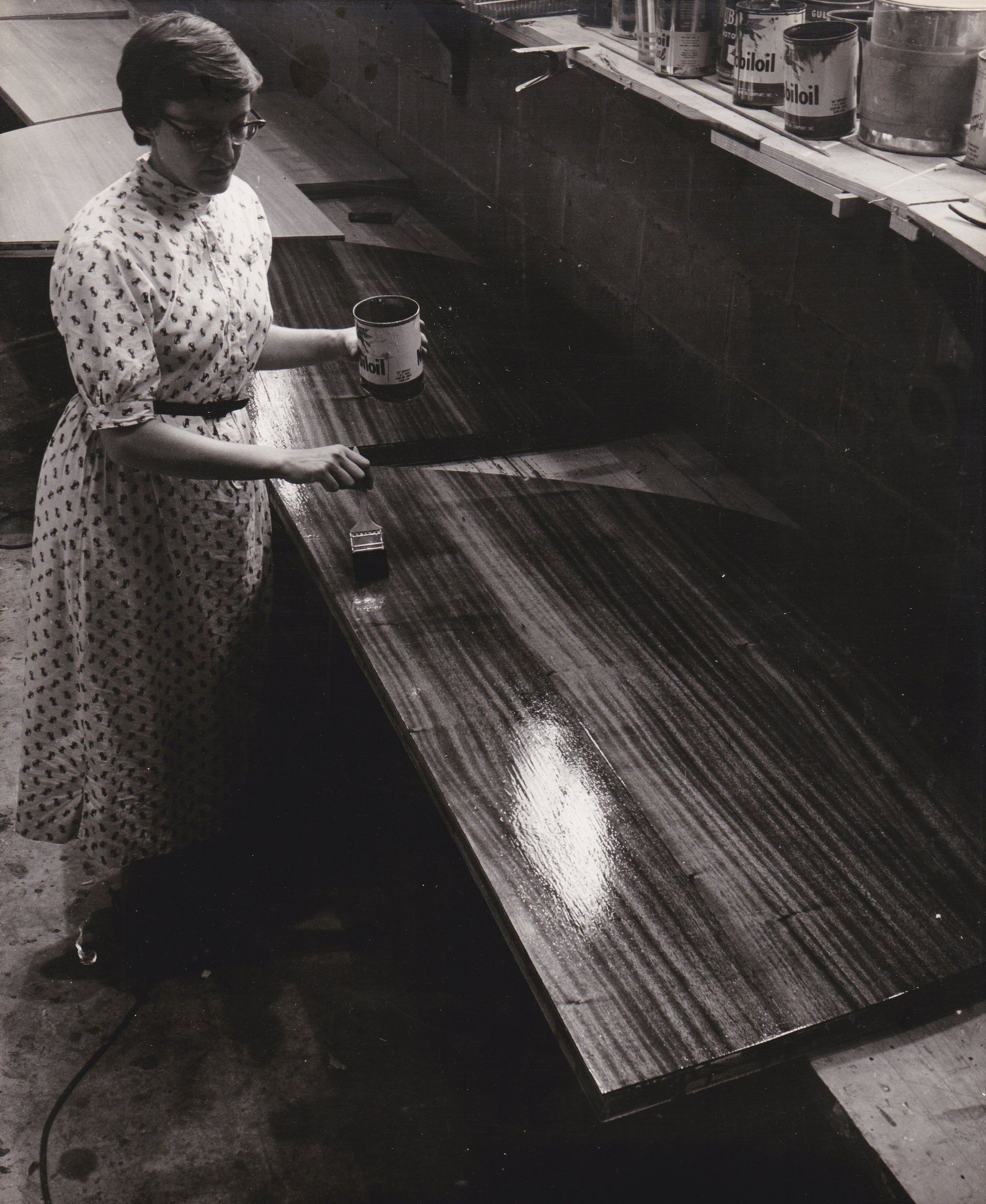 Madame Odette Filloux coating a poece of wood with resin(??)