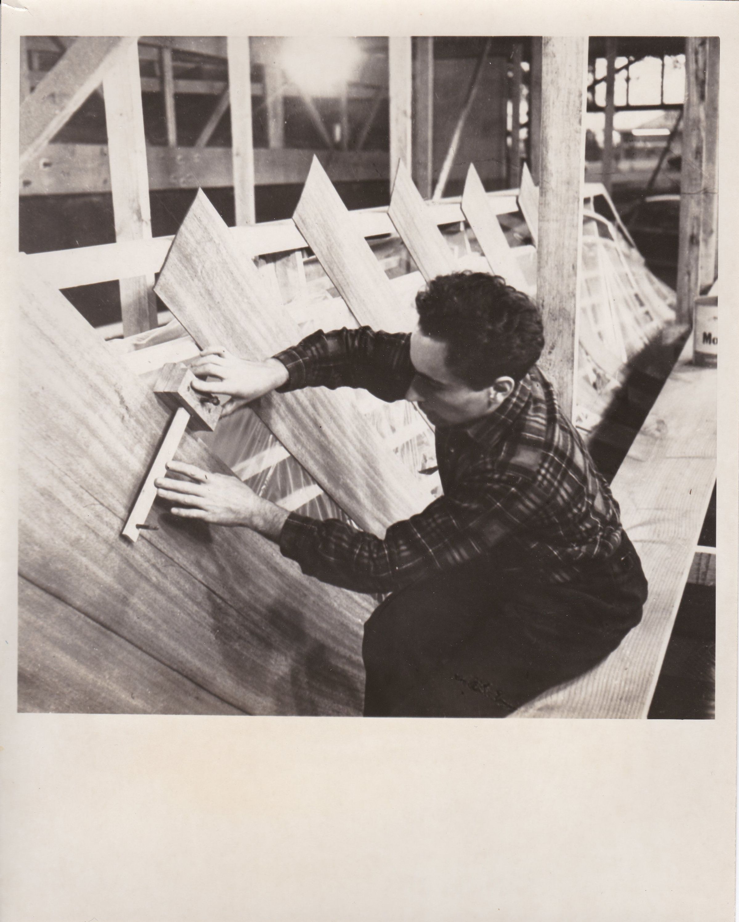 After all stations were set in place and fore and aft ribbanks secured, a plastic film was stapled over these ribbanks to prevent later to be used resin materials from sticking to the form, which was later removed. 1/8" thick, 5" wide veneer was then diagonally stapled over form to provide base for Fiberglas lamination.Collection