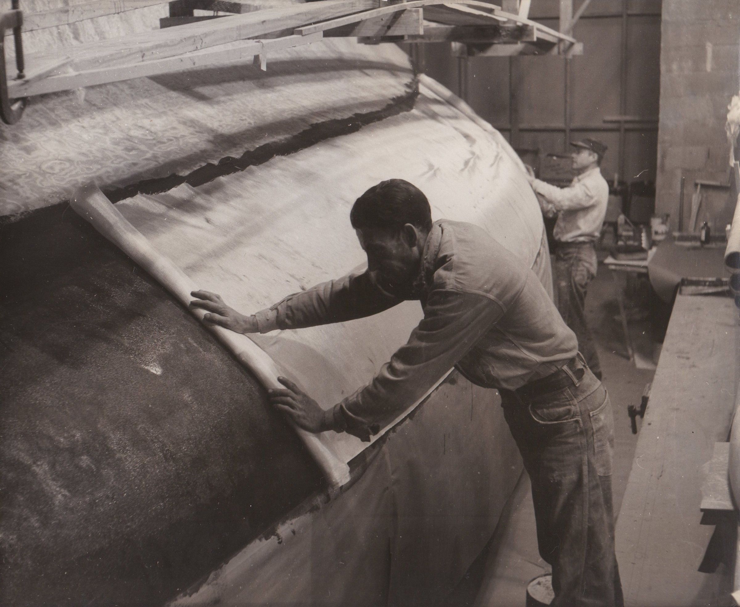 Jean Filloux and Leavenworth Holden putting fiberglass on the boat (another layer)Collection