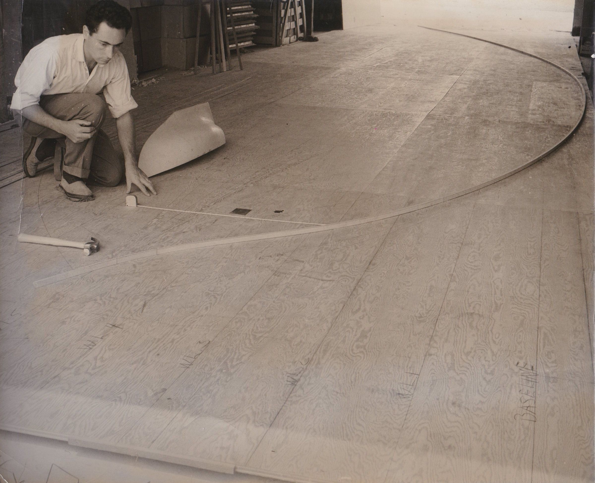 1- Jean Filloux inside the hull of the boat, placing plastic or fiberglass on it (??)