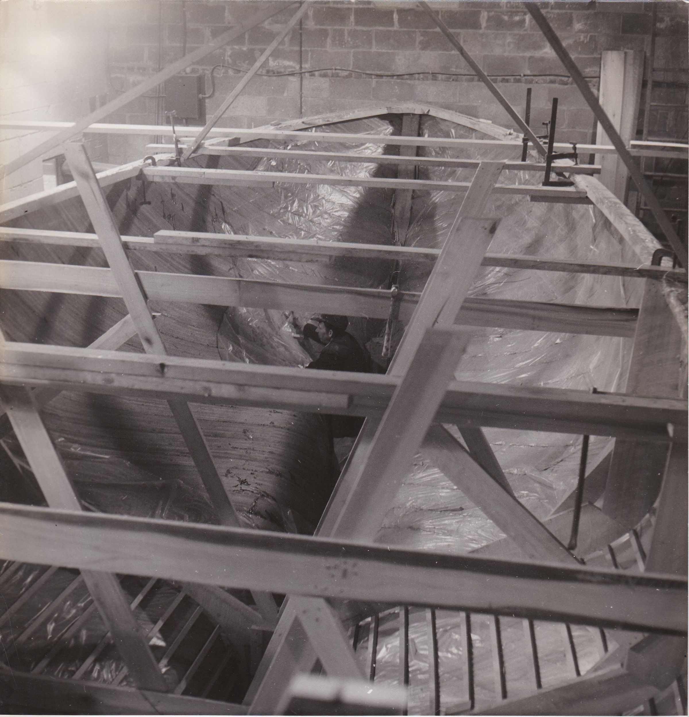 Jean Filloux inside the hull of the boat, placing plastic or fiberglass on it (??)