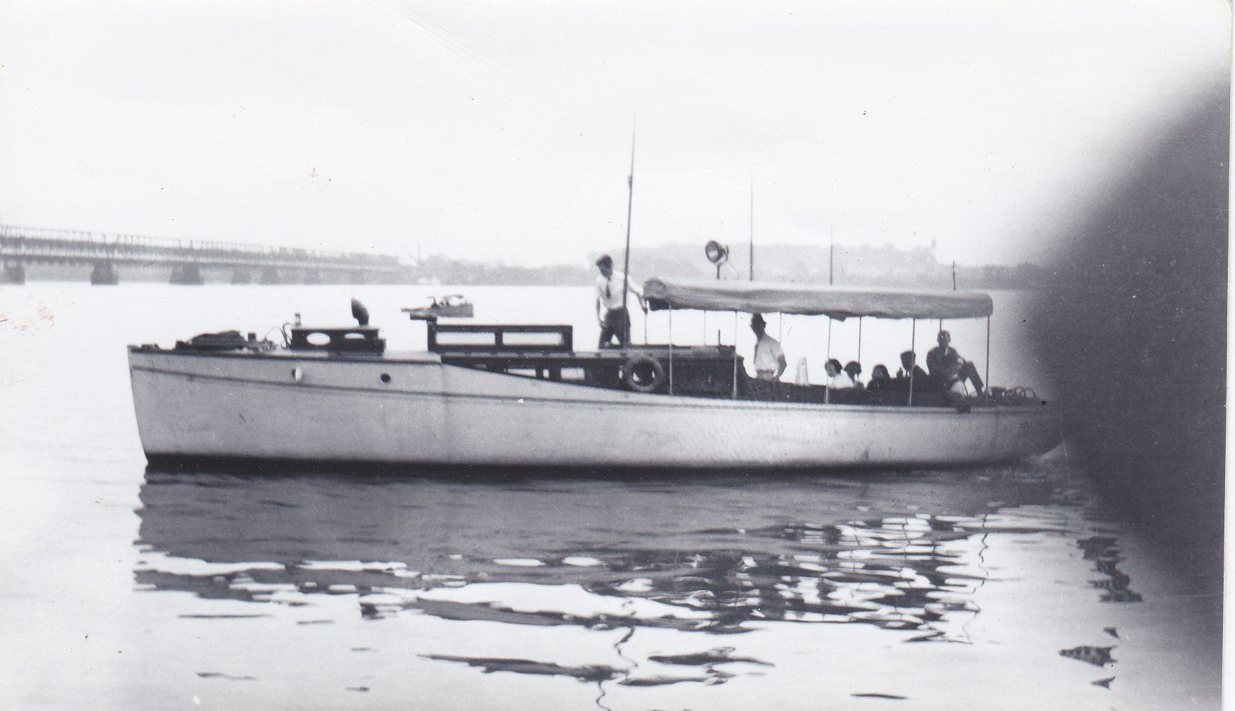 In the image at the front is a US flag with about 6 men aboard the boat.