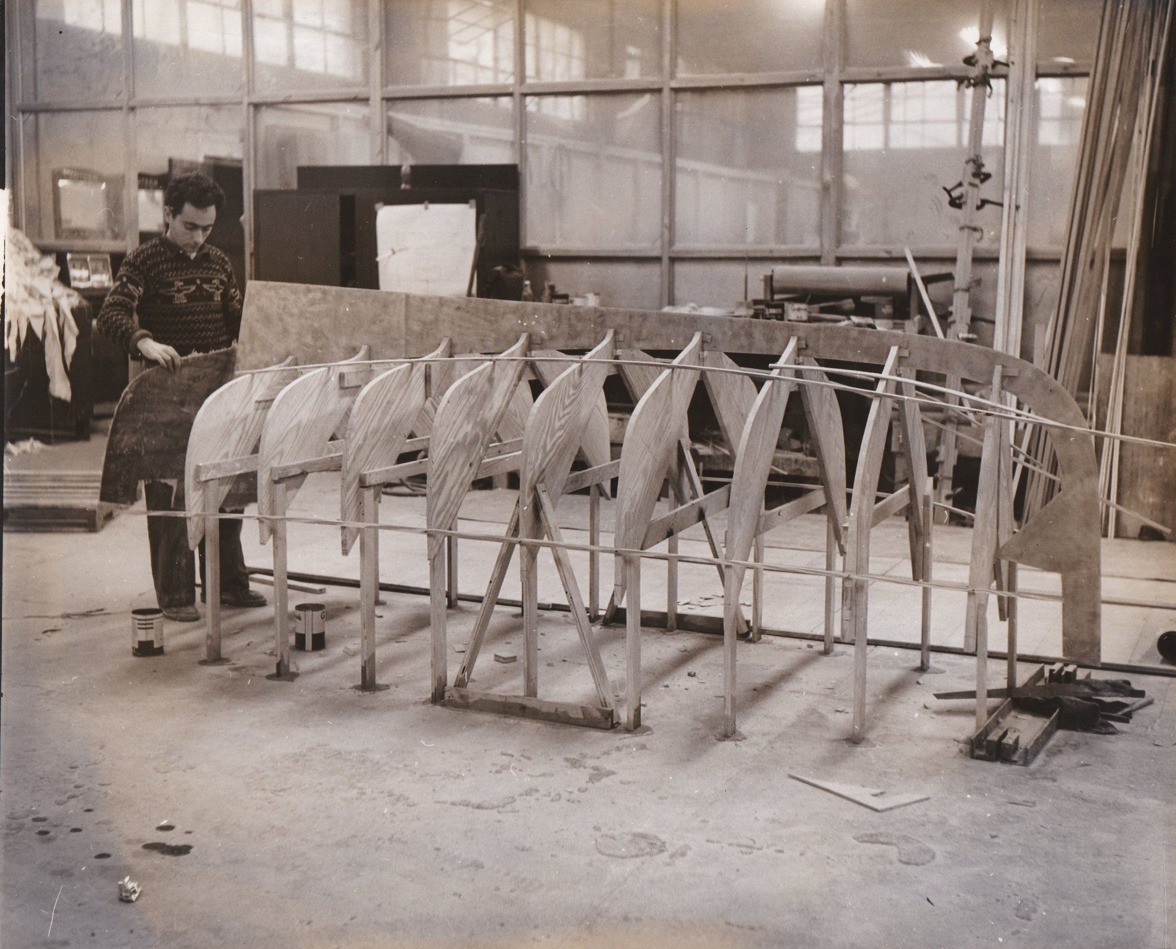 The molds are up. The middle one, the frist lifted is holding all of them vertical. Their feet are bounded to the floor with resin. On top of them the longitudinal master piece found its position.Collection
