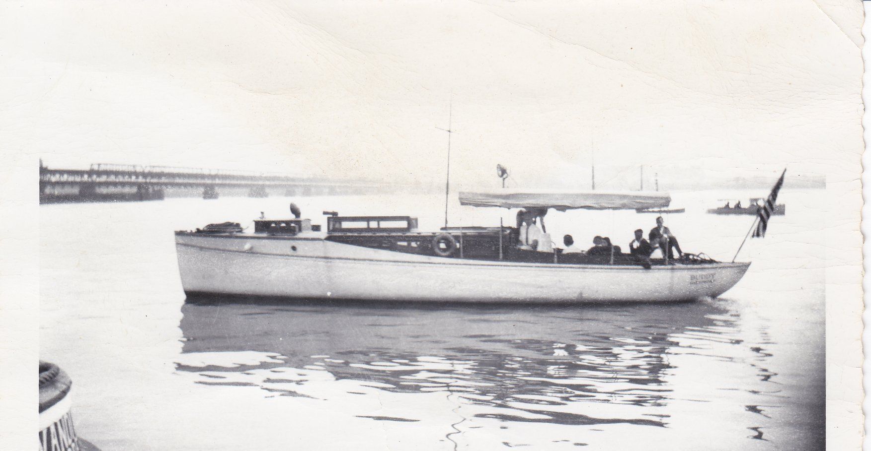 In the image at the back is a US flag with about 6 men aboard the boat.