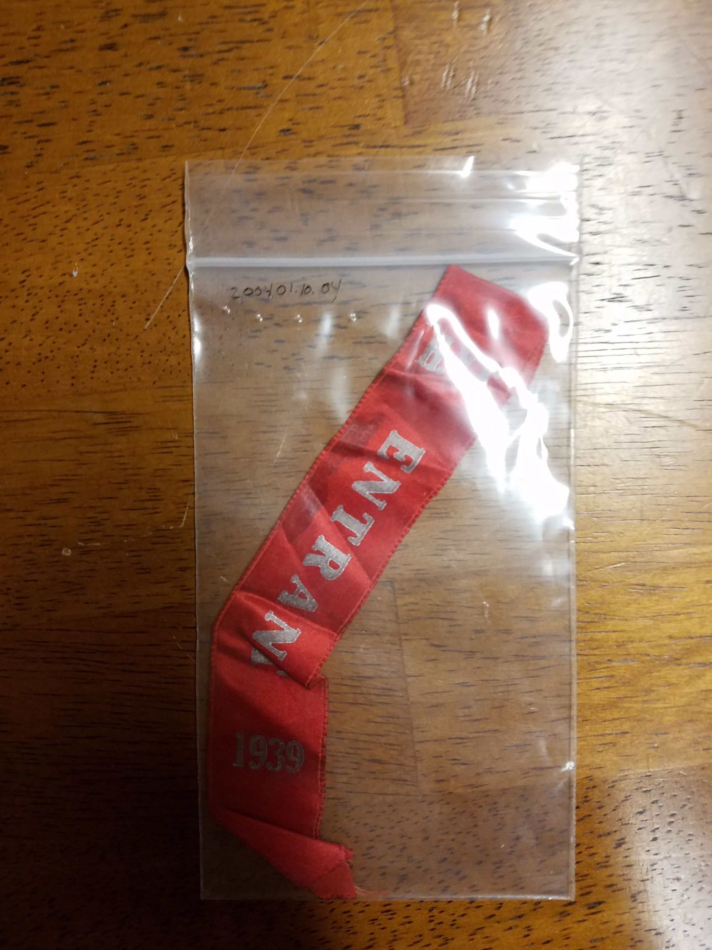 Red Entrant Ribbion at the top is H.Y.C. in gold color at bottom in gold is 1939