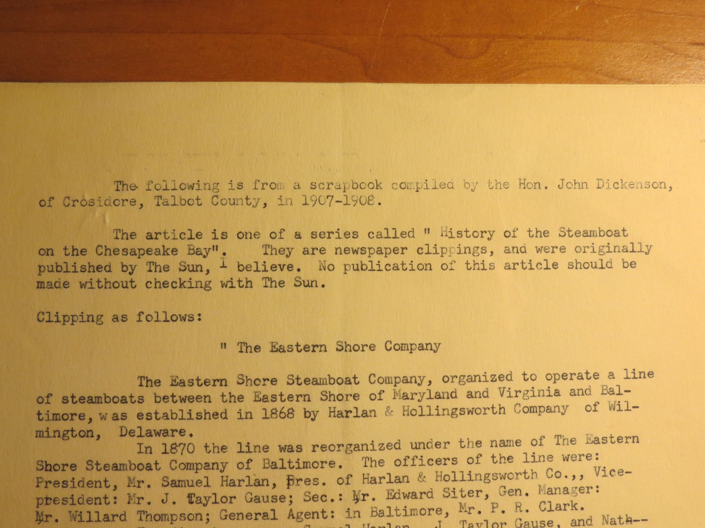 Excerpt from scrapbook compiled by Hon. John Dickenson, of Crosidore, Talbot County, in 1907-1908. Newspaper clipping: "History of the Steamboat on the Chesapeake Bay". Two typed pages.Condition