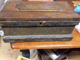 Wooden chest is stable and secure, but banged up. Brass fixtures could be polished. Keyhole/padlock is missing.