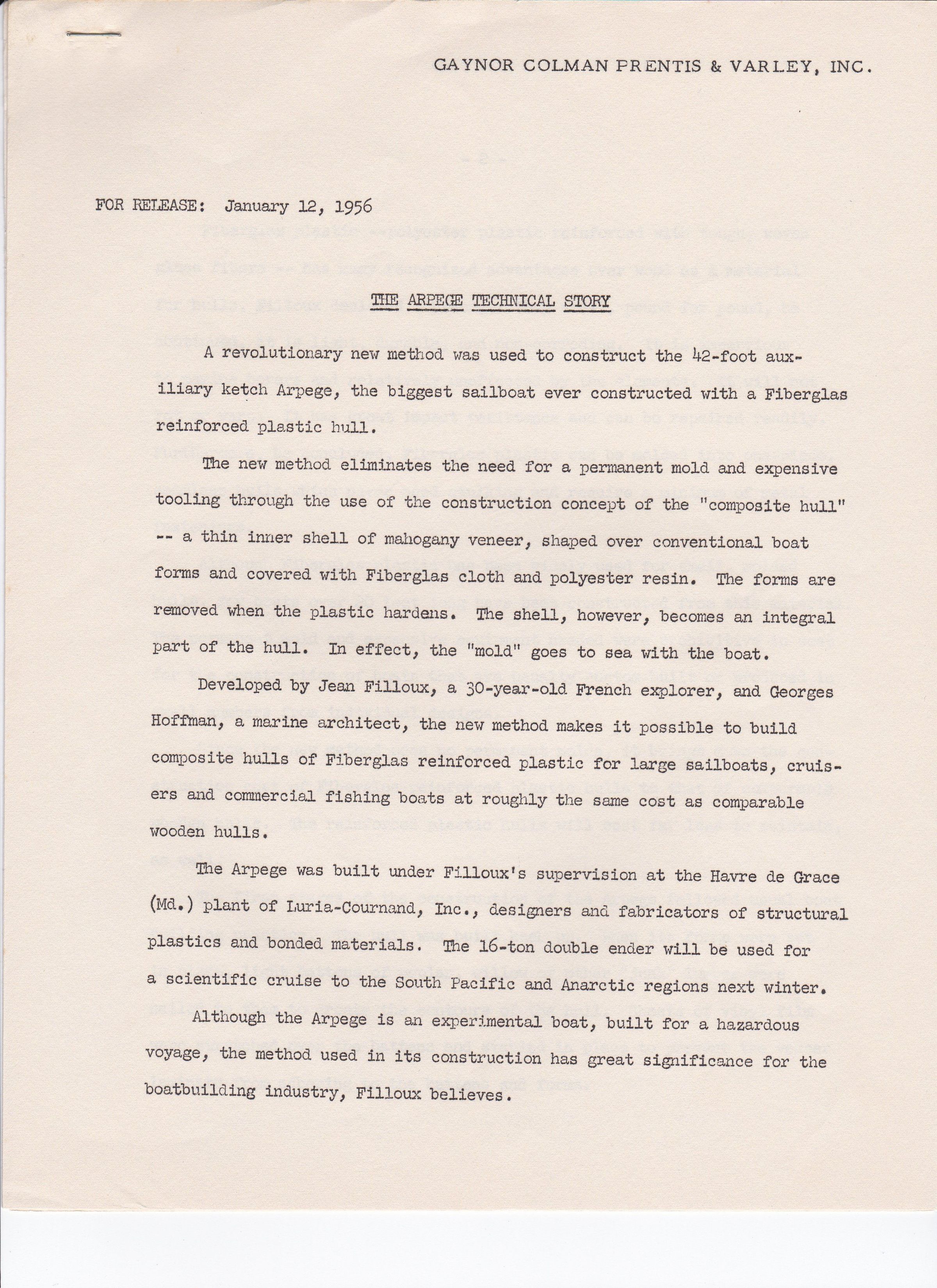 New method eliminates the need for a mold and expensive tools, by creating a composite hull-- a thin inner shell of mahogany veneer, shaped over converntional boat forms and coved with Fiberglas cloth and polyester resin. Developed by Jean Filloux, 30 year old Freanch engineer/ explorer, and George Hoffman, military architect. Jean Filloux speaks of why fiberglas is better then wood-- stronger then steel, light, durable, and non-corroding, wont rot or warp, and can be molded in a single piece -- no caulking needed.