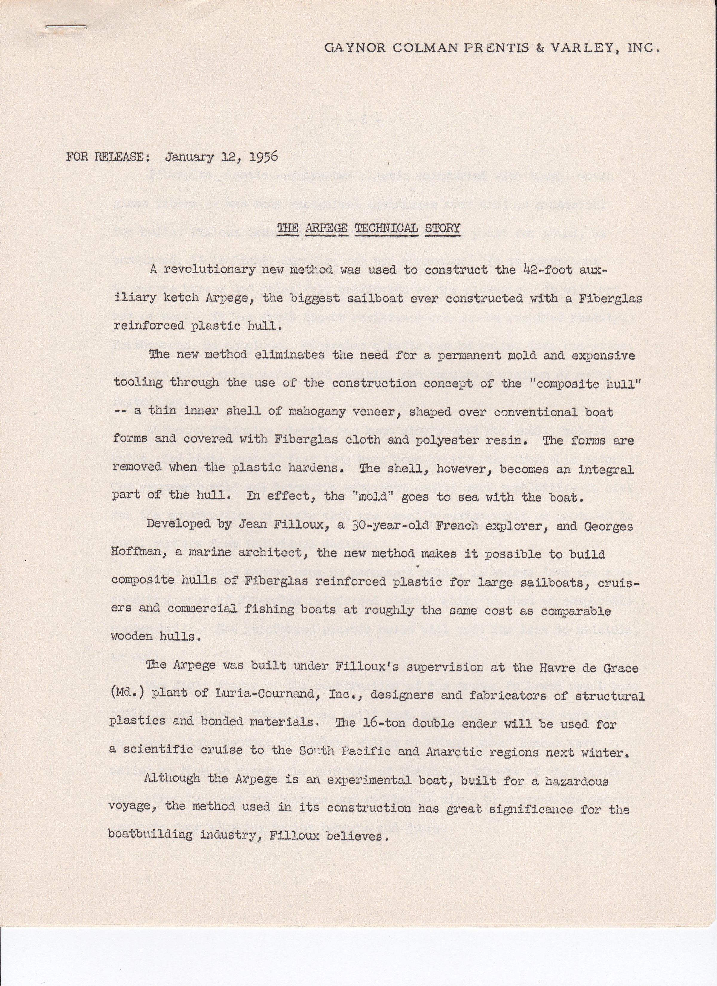 New method eliminates the need for a mold and expensive tools, by creating a composite hull-- a thin inner shell of mahogany veneer, shaped over converntional boat forms and coved with Fiberglas cloth and polyester resin. Developed by Jean Filloux, 30 year old Freanch engineer/ explorer, and George Hoffman, military architect. Jean Filloux speaks of why fiberglas is better then wood-- stronger then steel, light, durable, and non-corroding, wont rot or warp, and can be molded in a single piece -- no caulking needed.