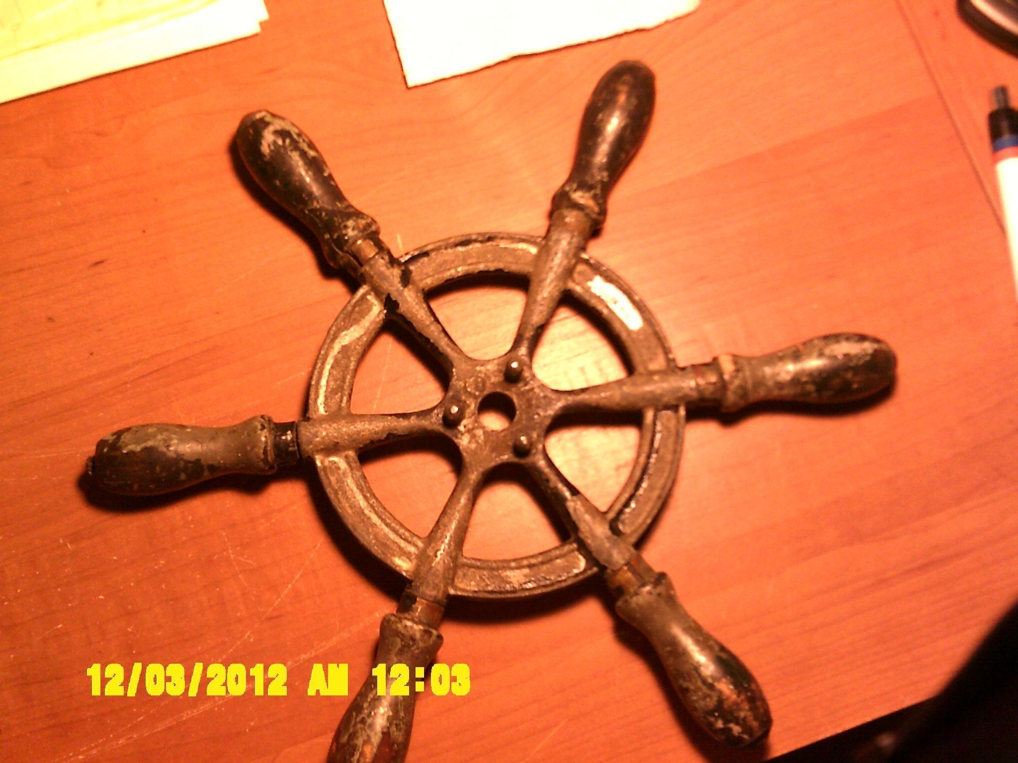 Boat steering wheel. Metal wheel with 6 wooden handles. Paint is flaking. There is black, green and gray paint present.