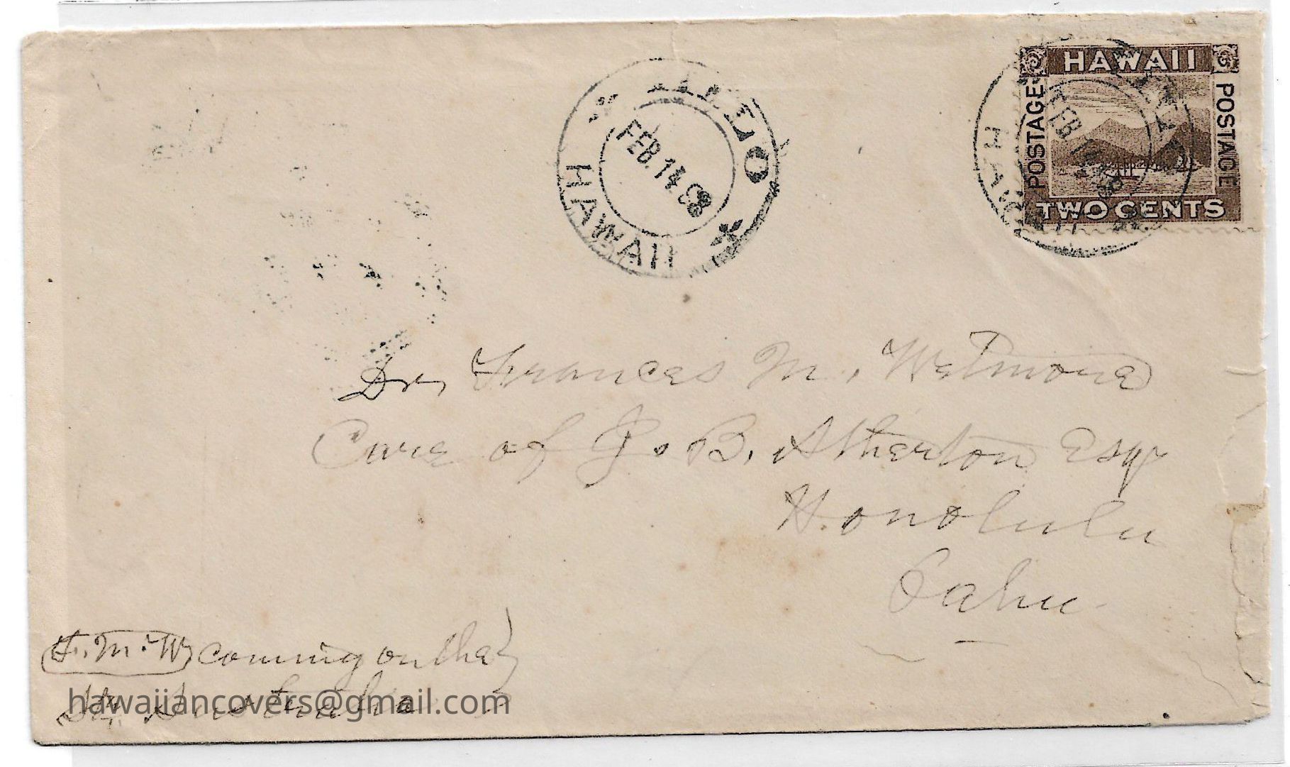 ![Author's Personal Collection: Cover cancellation date of Feb 14, 1898 from Hilo to Dr Frances M. Wetmore Care of J. B. Atherton Esqr.