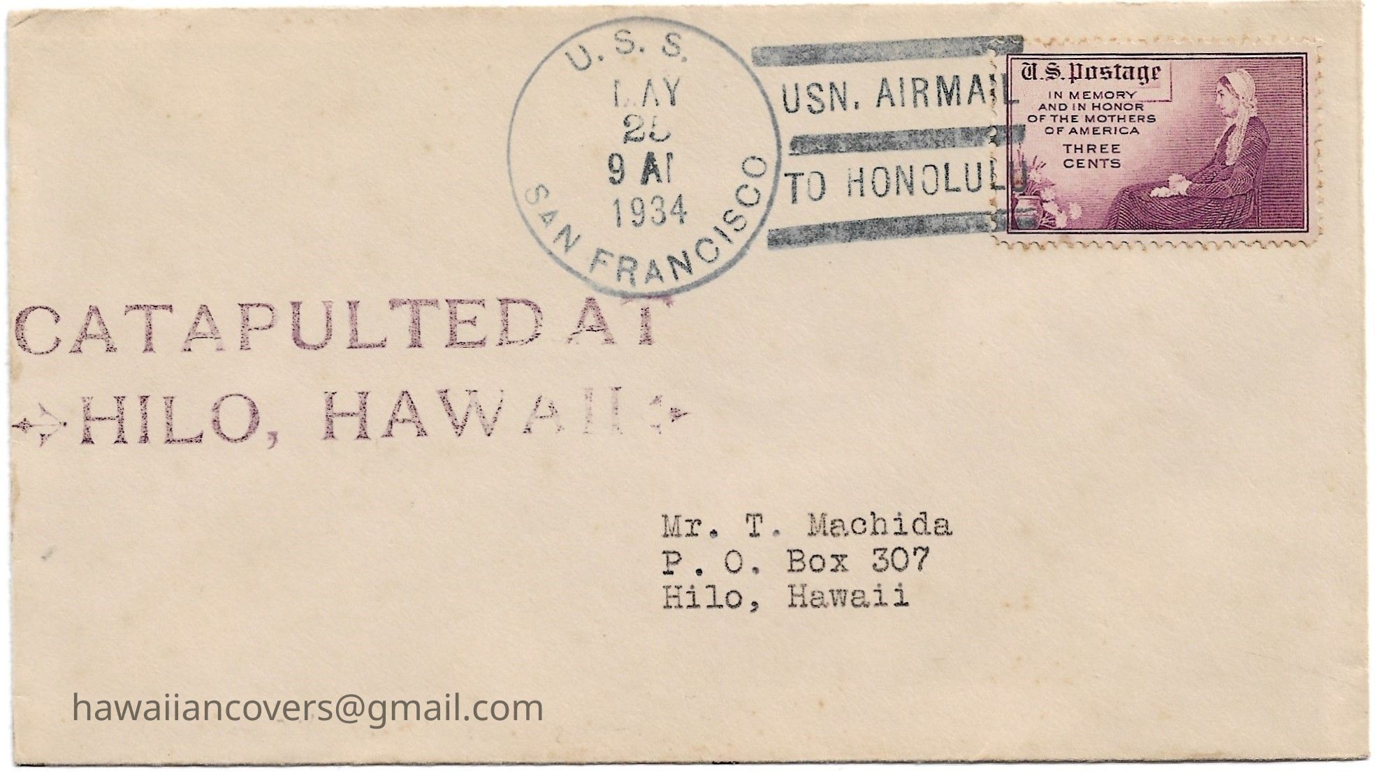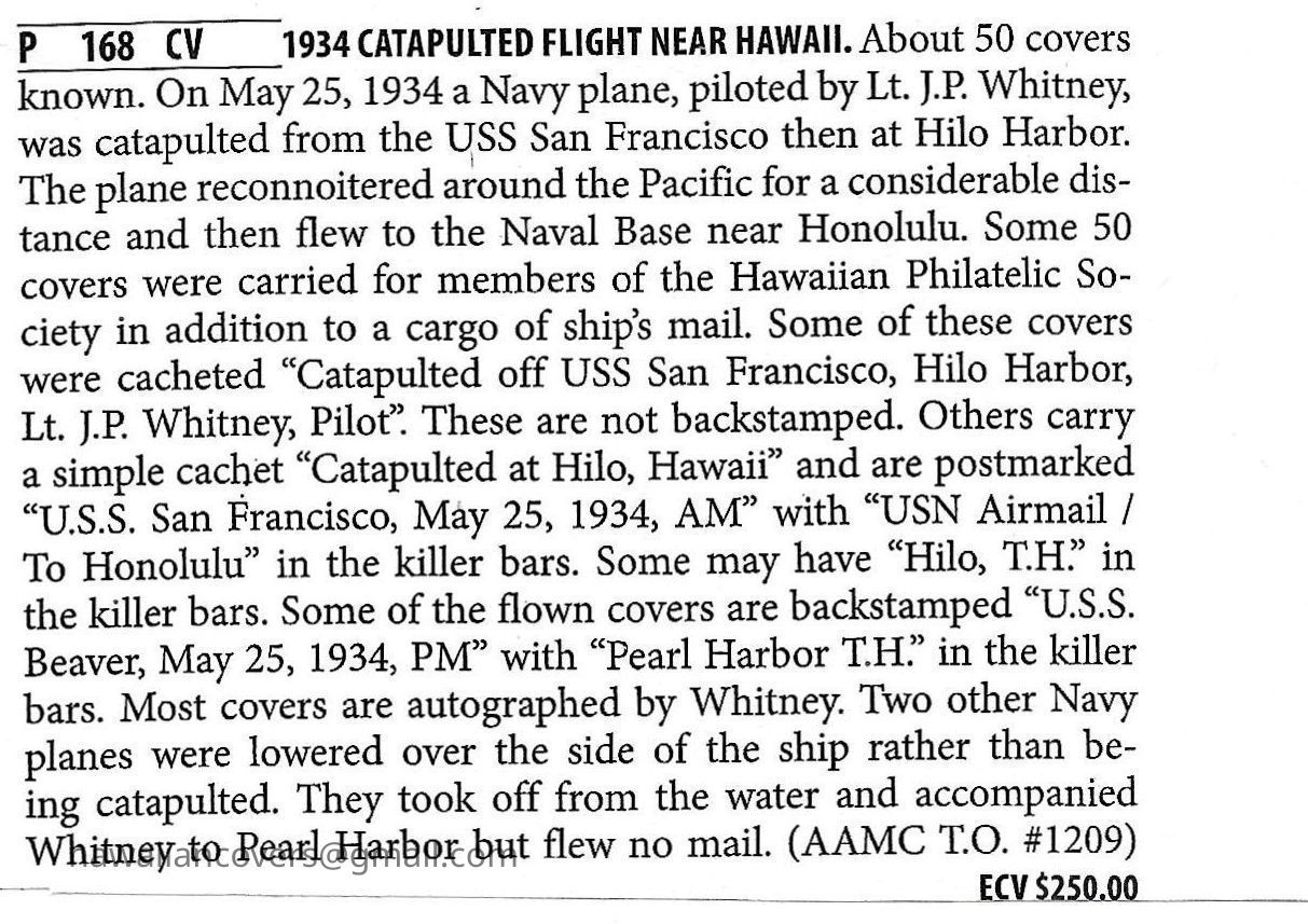 From accompanying sheet, only 50 covers known. On May 25, 1934, a Navy plane piloted by Lt. J.P. Whitney, was catapulted from the USS San Francisco then at Hilo Harbor. Some 50 covers were carried for the members of the Hawaiian Philatelic Society in addition to a cargo of the ship's mail.