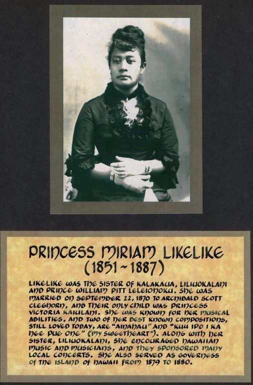 She married Scottish businessman Archibald Scott Cleghorn in 1870 and was the mother of Princess Kaʻiulani, the last heir to the throne before the 1893 overthrow of the Hawaiian Kingdom. Likelike was the first mistress of the ʻĀinahau estate, which became associated with her daughter. She was Governor of the island of Hawaii from 1879 to 1880.