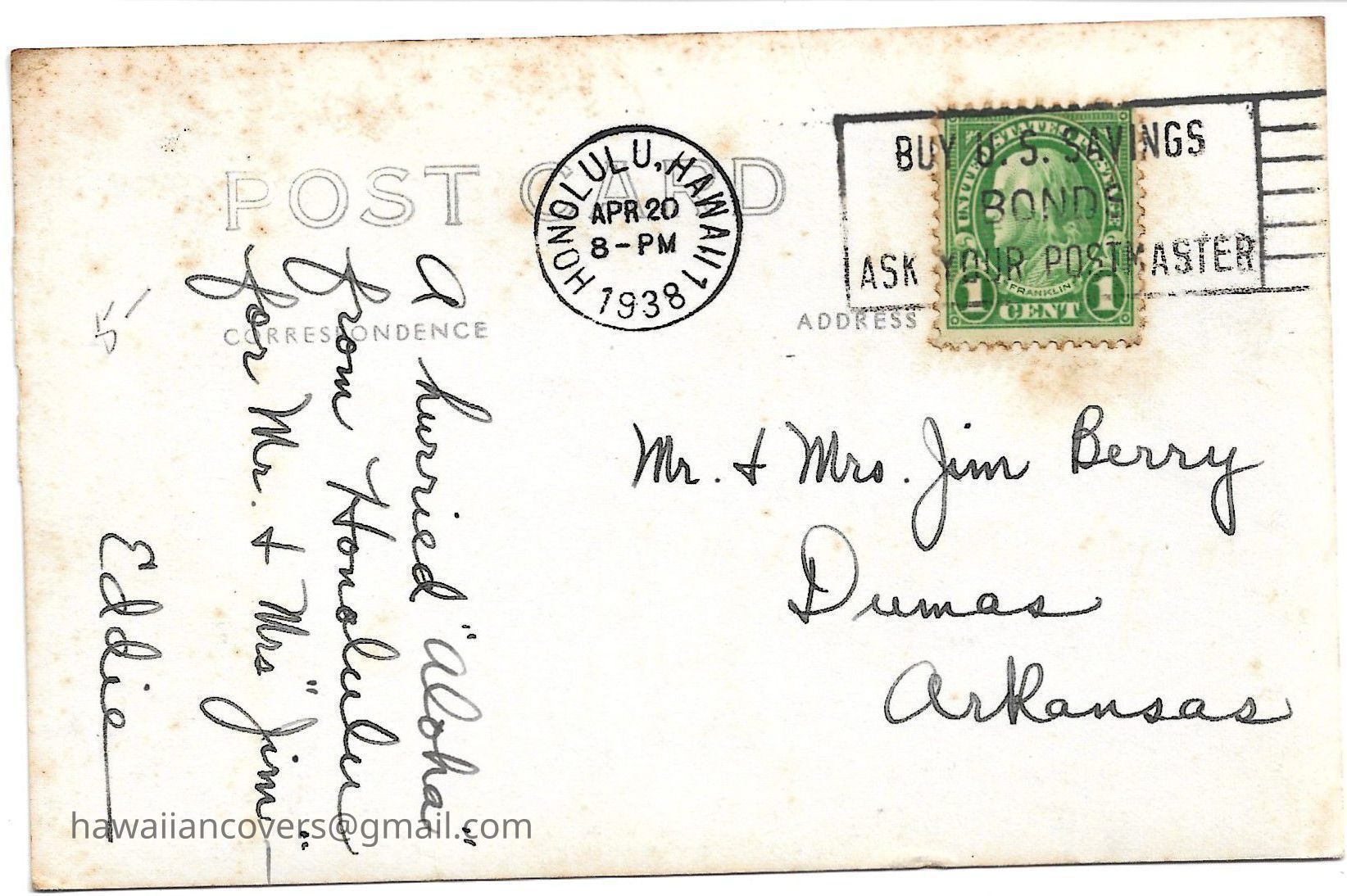 Moanalua Gardens Honolulu Postcard cancellation date April 20, 1938 Honolulu
