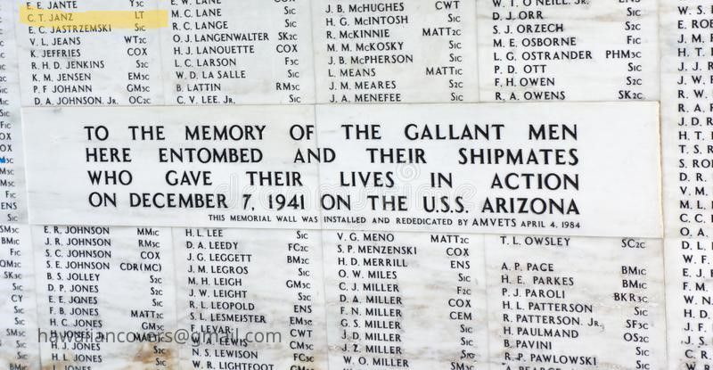 Lieutenant Clifford T. Janz, who joined the U.S. Navy from California, was aboard the Arizona on the day of the Pearl Harbor attack. He was among the men lost with the ship and his remains have not been recovered. Today, Lieutenant Janz is memorialized on the Courts of the Missing at the National Memorial Cemetery of the Pacific.Created By
