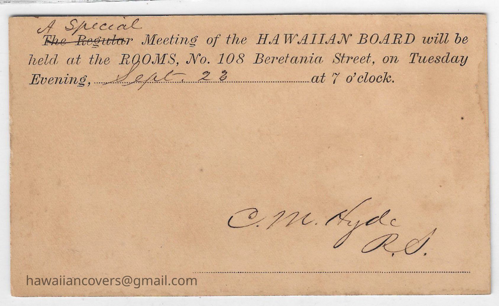 Card sent to A.F. Judd from C. M. Hyde regarding a "Special Meeting" of the "Hawaiian Board" on Sept 22, 1880.Created By