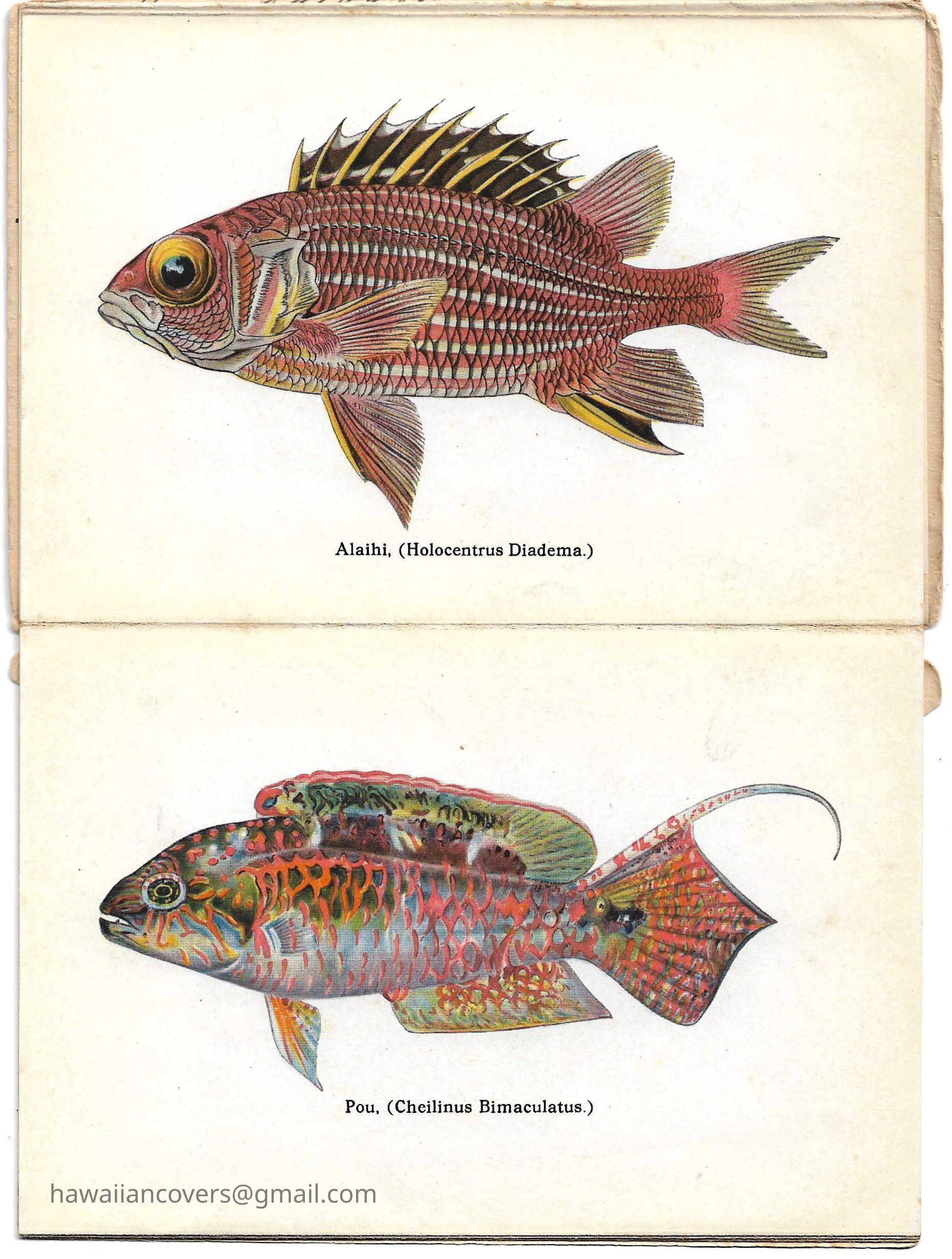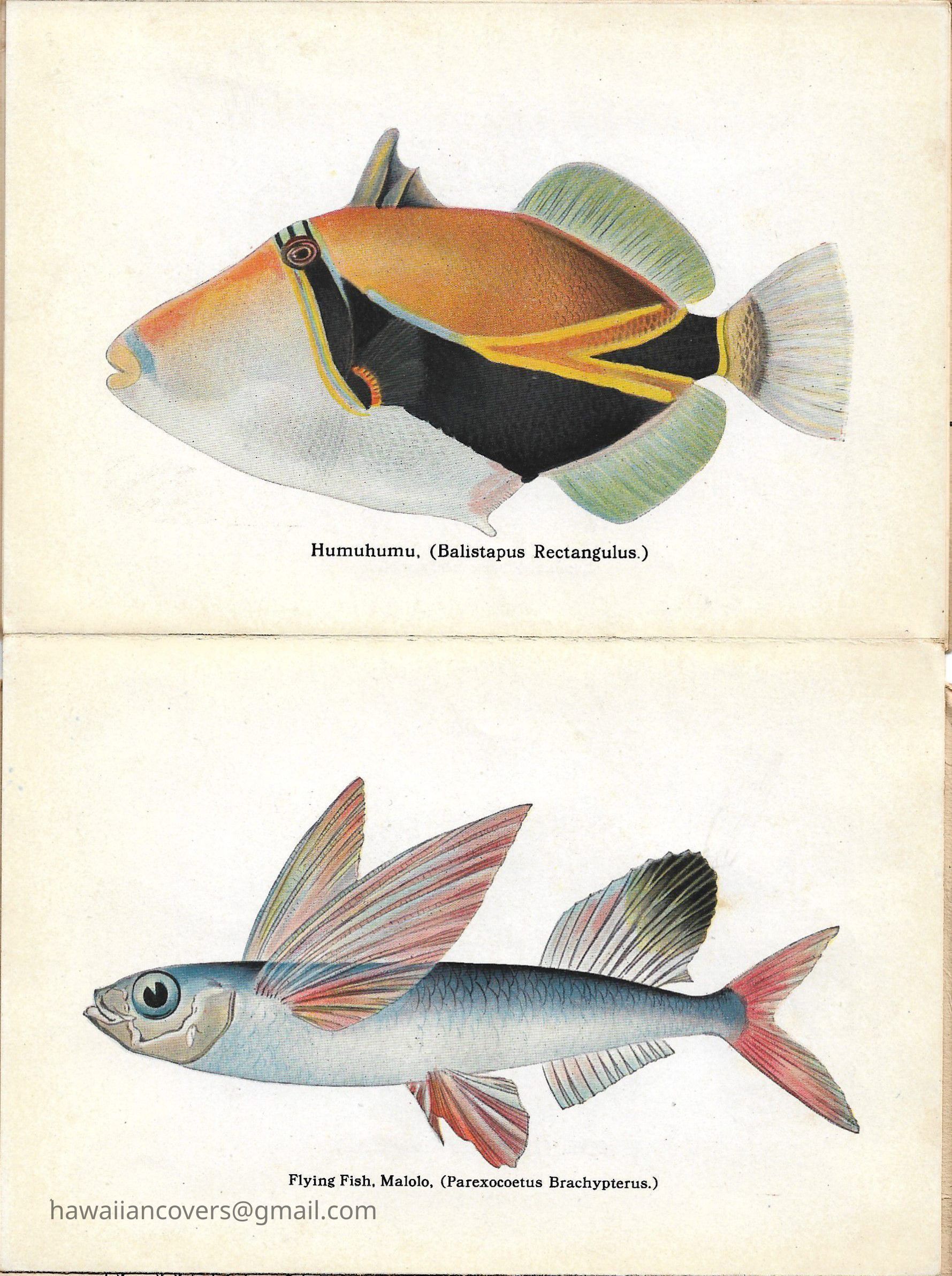 A colorful album featuring the fishes of Hawaii. It is a souvenir mailing piece produced by the Honolulu Aquarium. Inscribed by sender April 10th, 1916.Created By
