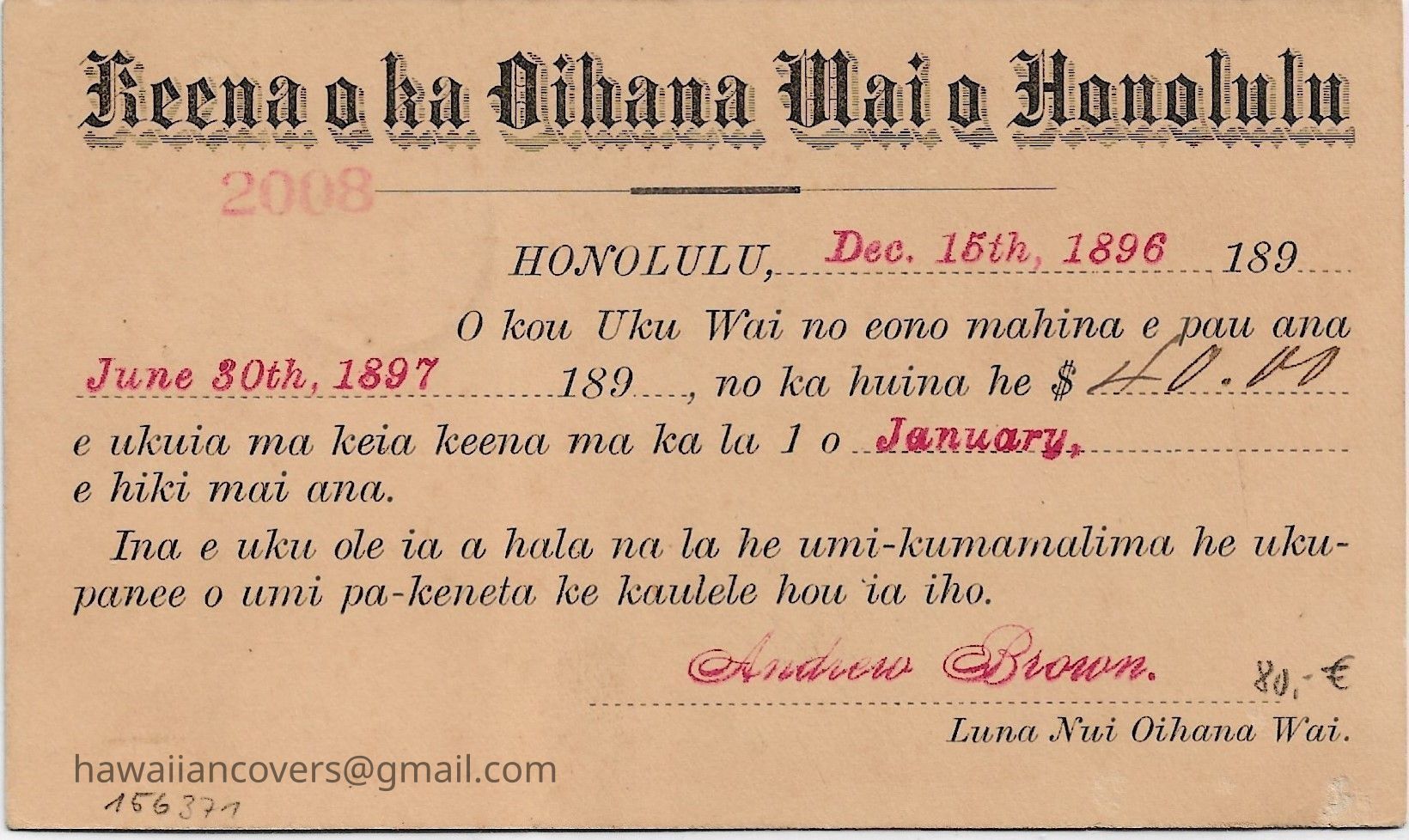 Andrew Brown was born in Glasgow, Scotland on January 25, 1849,14 and was a citizen of the United Kingdom when he participated in the overthrow of the Hawaiian monarchy. When he was 20 years old he moved to Canada, working as a coppersmith. He later lived in San Francisco, employed by the Pacific Mail Steamship Company.15 He immigrated to Hawai‘i in 1880. His wife, Sarah (Reade) Brown died in Honolulu on October 11, 1887. He started as a coppersmith at the Honolulu Iron Works about the same year. Initially a member of the Advisory Council of the Provisional Government, Brown left that position when he became the superintendent of Water Works on March 1, 1893.After the overthrow, Brown was granted “special rights of citizenship” by the Republic of Hawai‘i on July 21, 1894. The status gave him the rights of Hawaiian citizenship without having to renounce his United Kingdom citizenship. Superintendent for nearly a decade, Brown wrote an article, titled “The Water System and Supply,” in the January 1, 1902, issue of the Pacific Commercial Advertiser. Just two years later, he was asked to resign in March 1904 after it was discovered that he had known about embezzlement by one of his employees and had “allowed the alleged