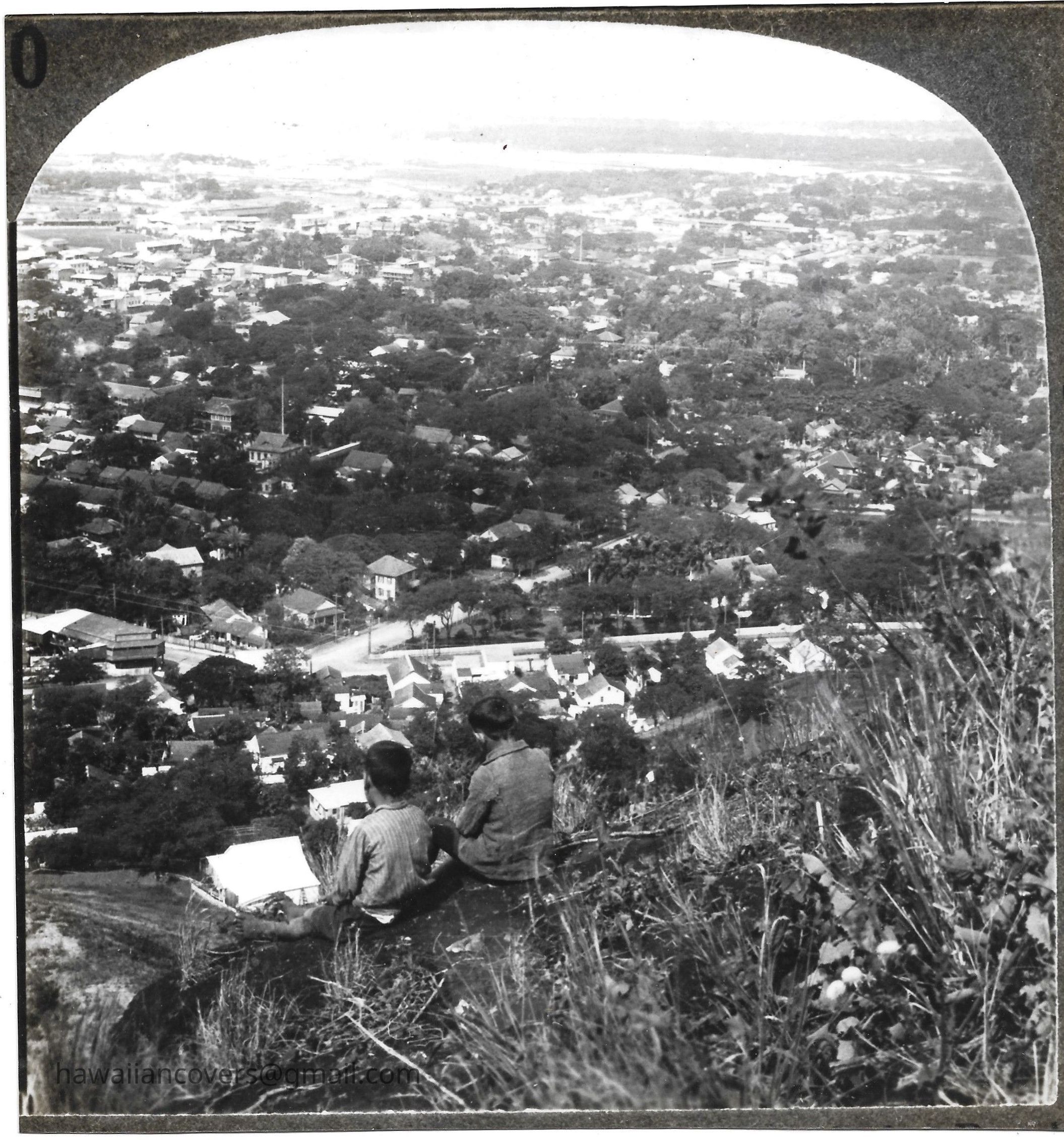 Two boys along side a hilltop overlooking Honolulu. Circa 1940's.