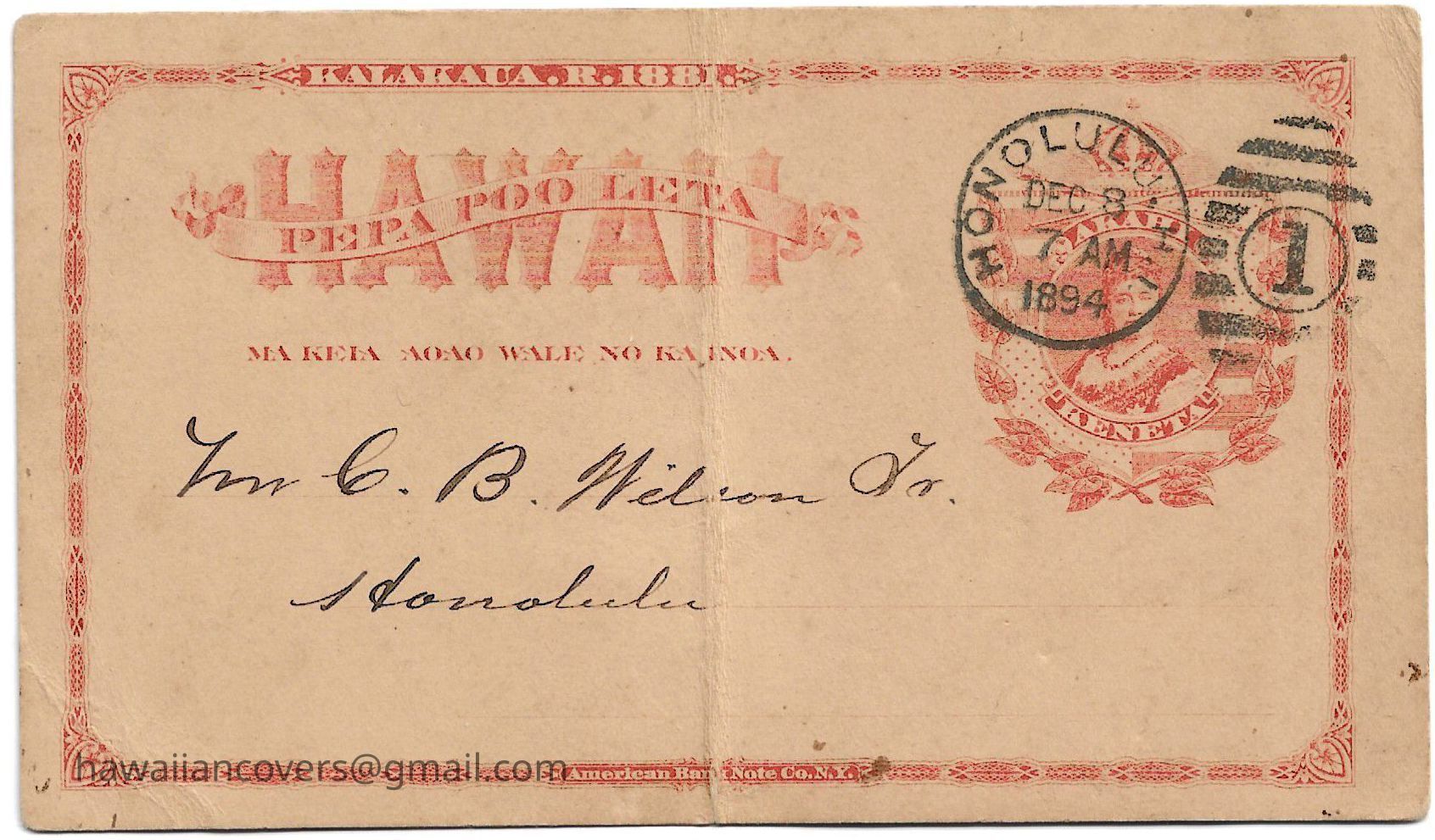 Postal Card addressed to C.B. Wilson postmarked Dec 8, 1894