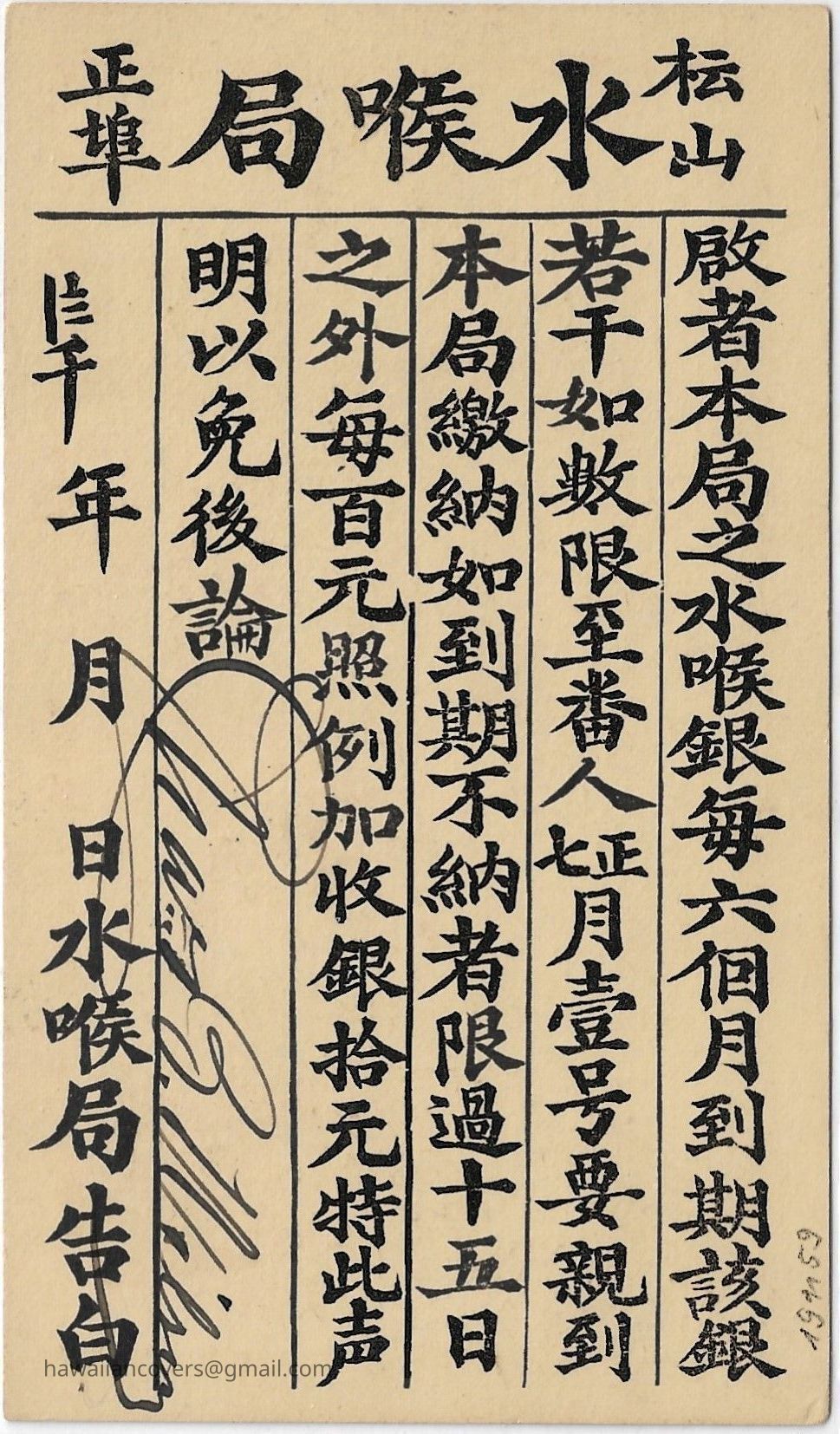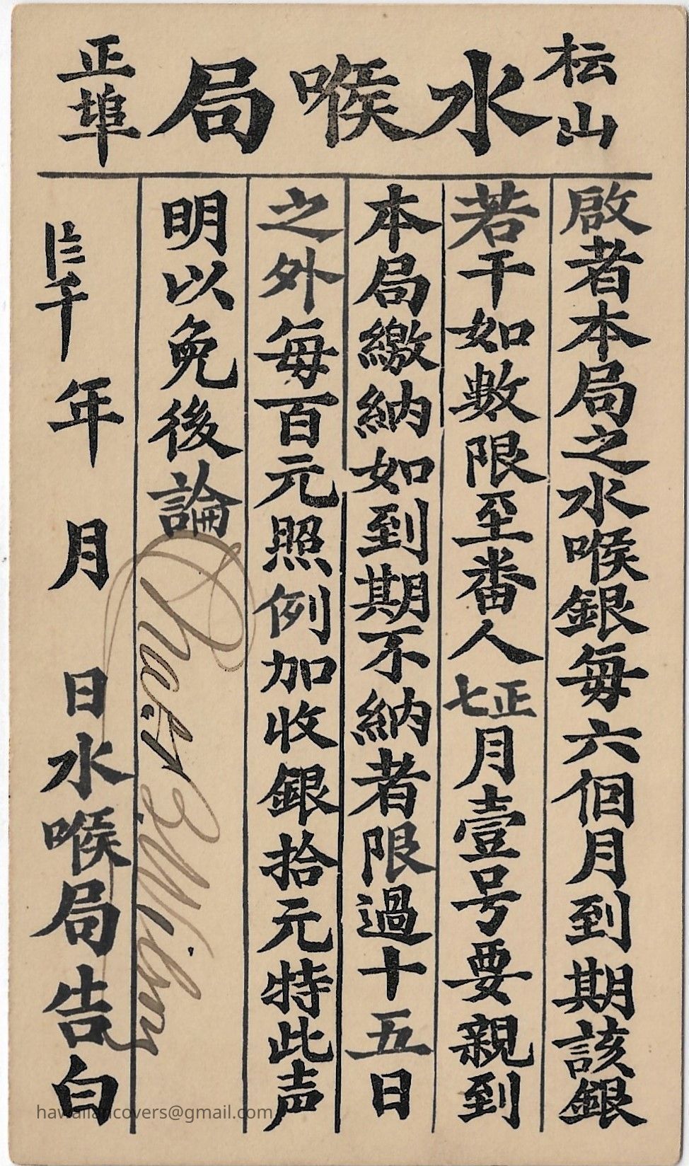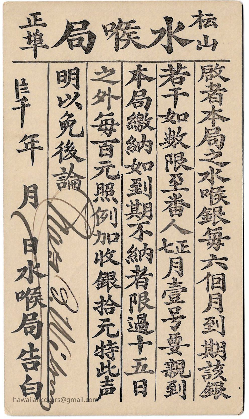 Water bill printed in Chinese, Honolulu water bill postal card, Kingdom of Hawaii.
