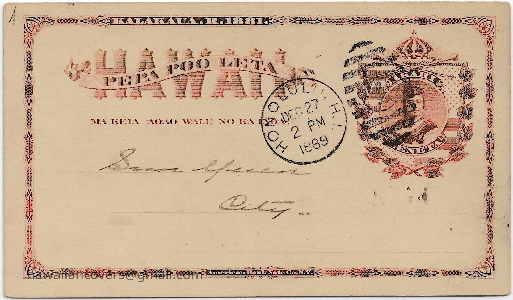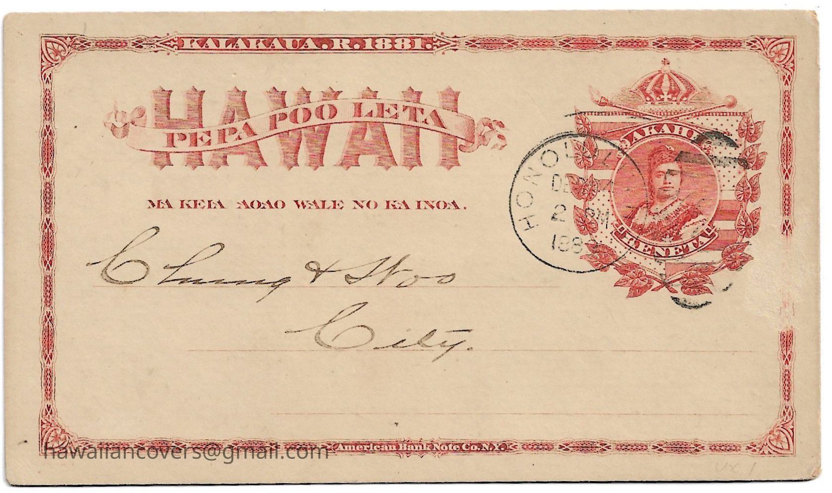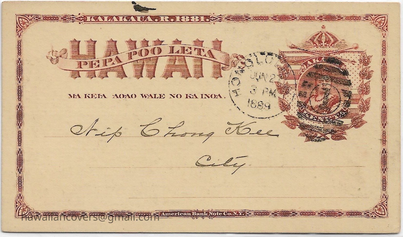 Water bill printed in Chinese, Honolulu water bill postal card, Kingdom of Hawaii.